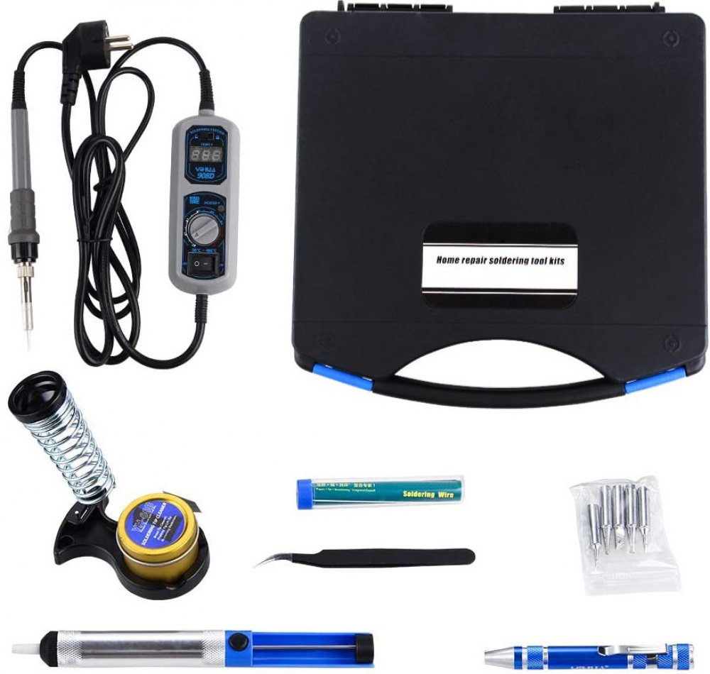 Přenosná servisní mikropájka Yihua 908D 65W s digitálním řízením teploty a bohatým příslušenstvím s praktickým kufříkem pro snadný transport.