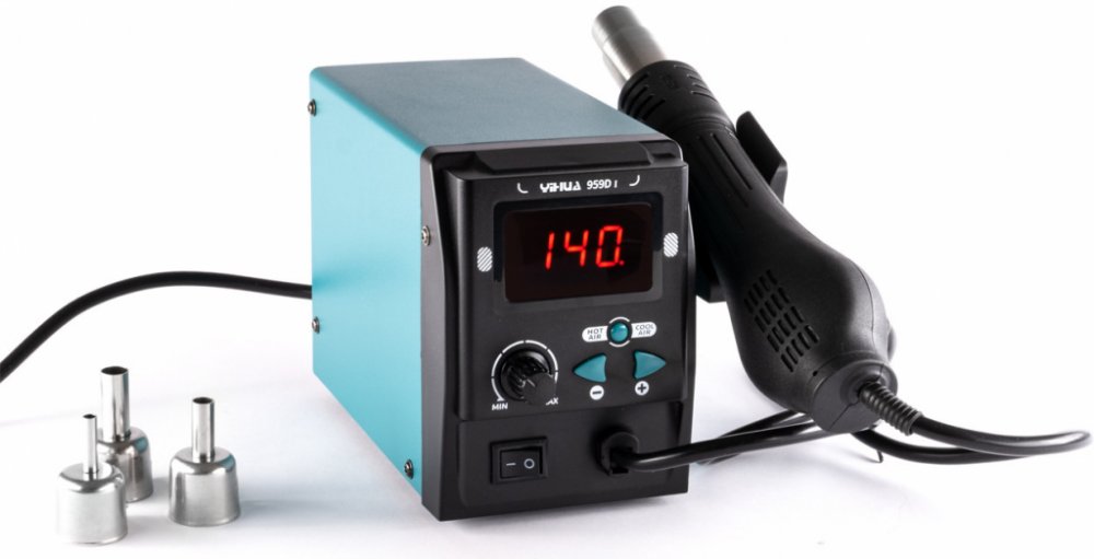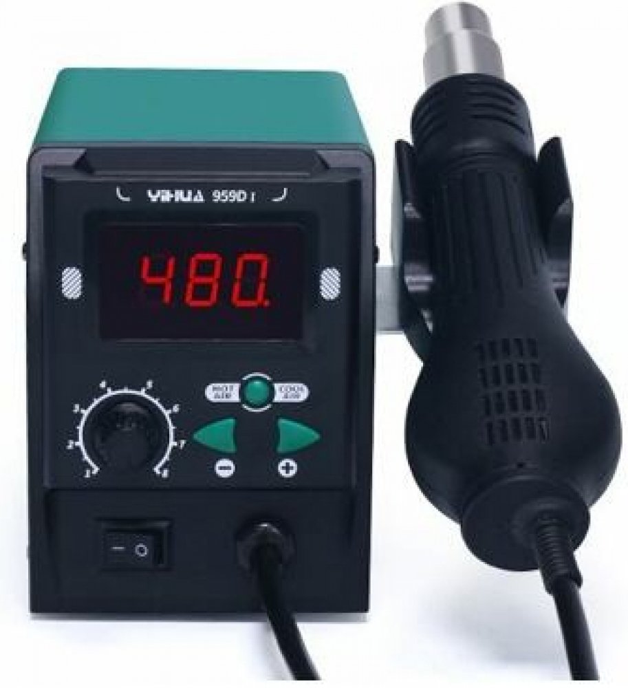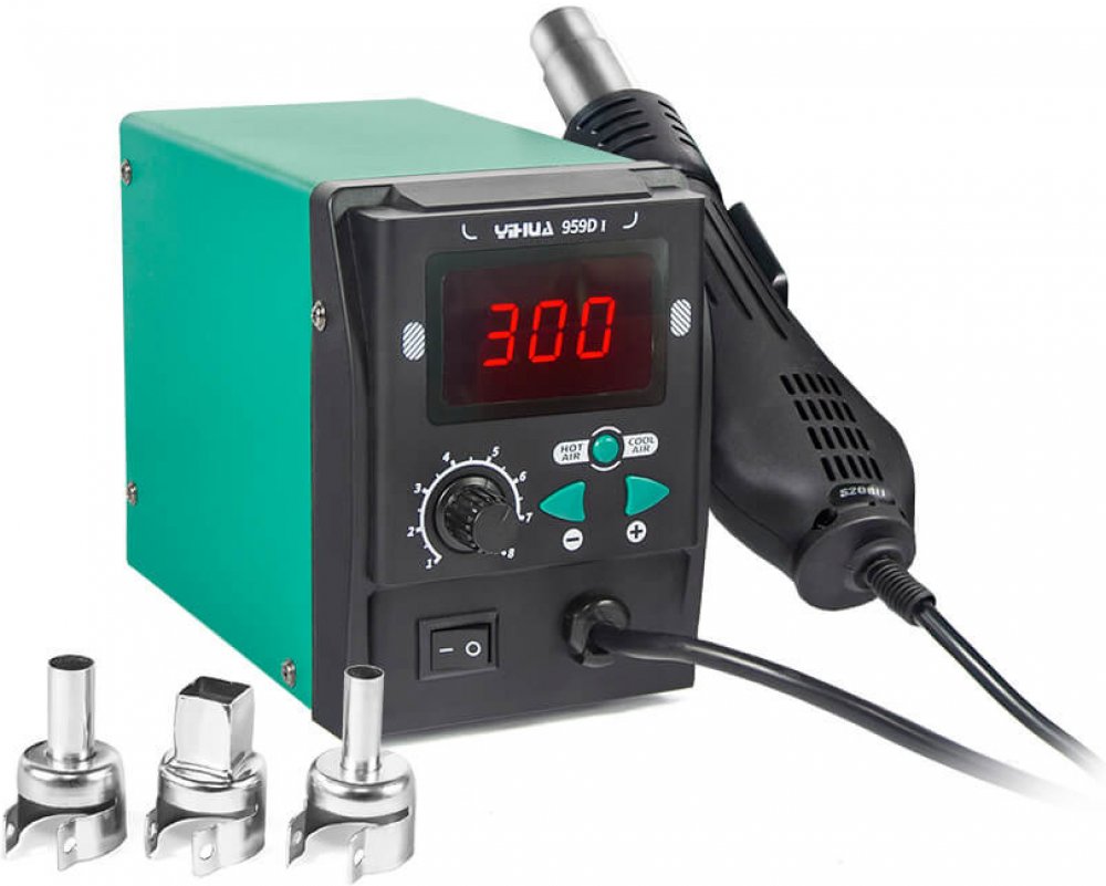 Pájecí stanice Yihua 959D-I je vybavena výkonným topným tělesem zajišťujícím rychlý ohřev a trvanlivost s plynule nastavitelným vzduchem a teplotou. V rukojeti pájedla je namontována vzduchová turbína s vysokým průtokem max. 120 l / min její střídavý motor je tichý a poskytuje stabilní výfuk.. Stanice je navržena pro pájení komponentů, jako jsou SOIC, QFP, PLCC, BGA, SMD a k svařování plastů ..... Stejně jako vytápění, vyhřívaní, smršťovaní bužírek, rozmrazování, rozpouštění lepidla, opalování barev atd...