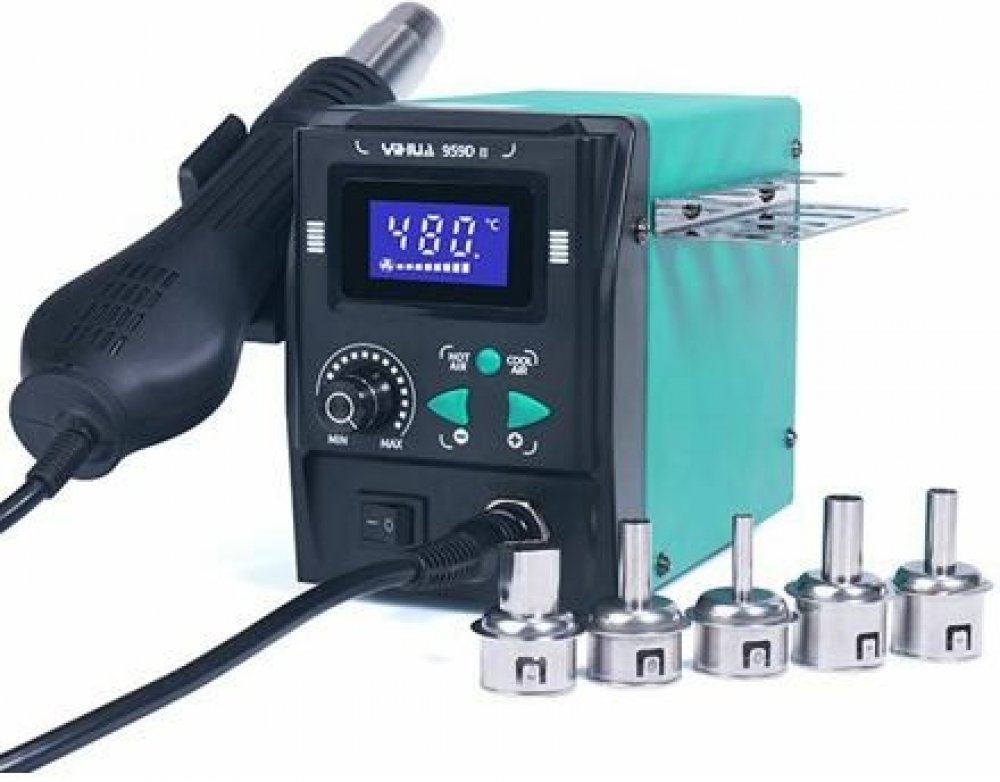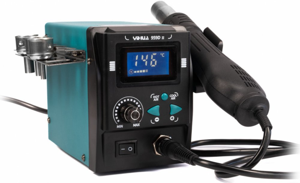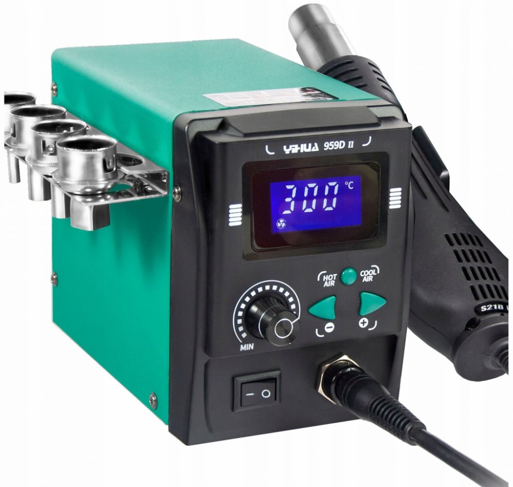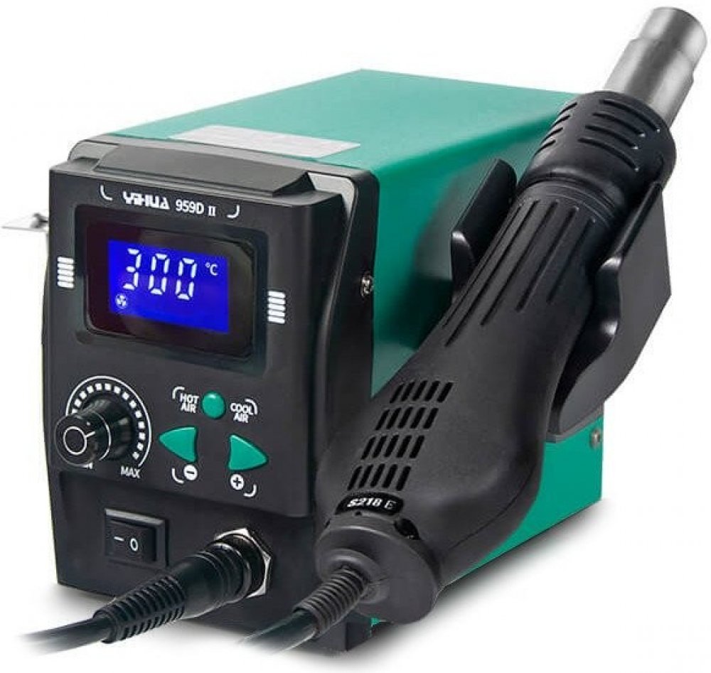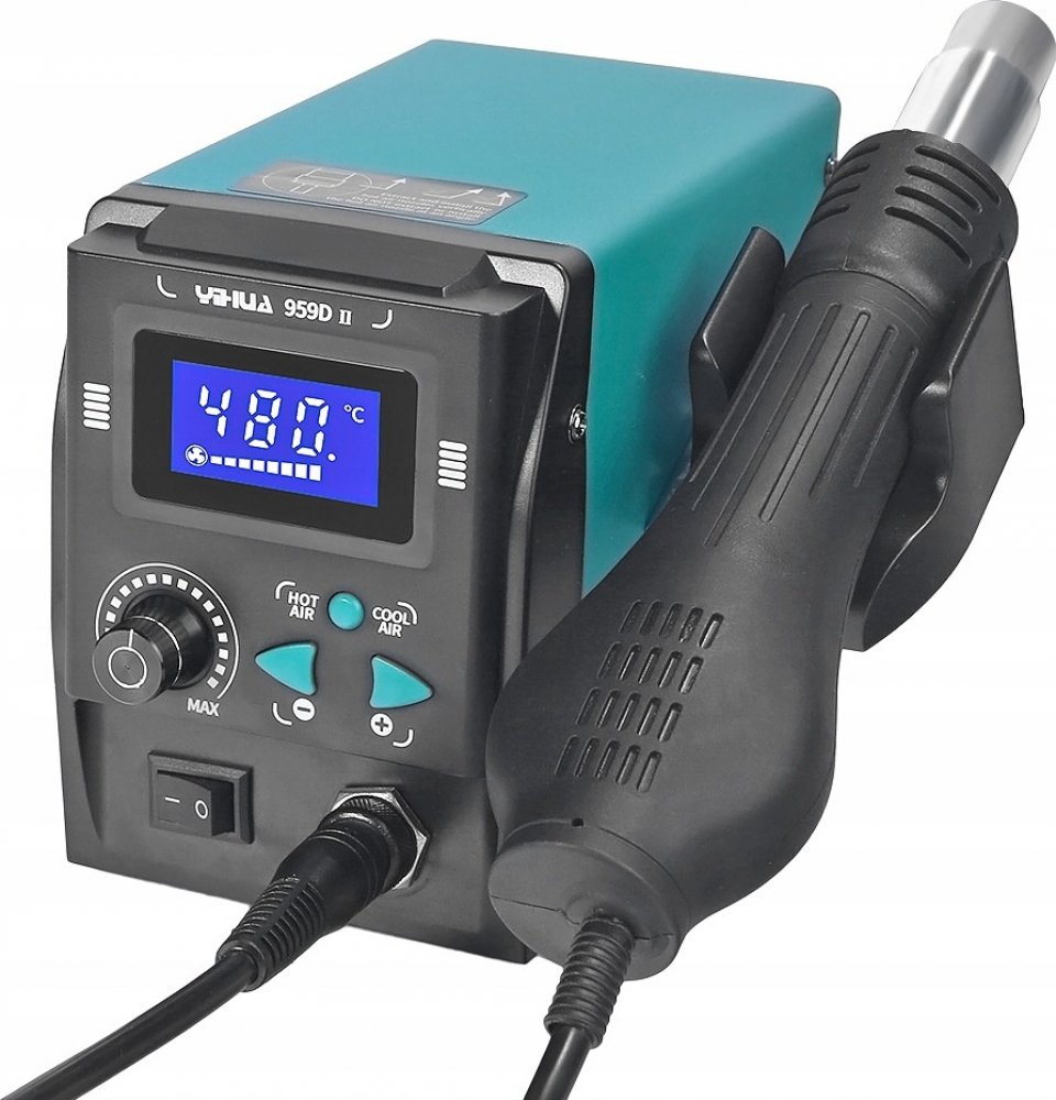 Díky integrovanému turbodmychadlu přímo v ručce je stanice YIHUA 959D-II velmi kompaktní a lehká, chod turbíny je tichý, především v maximálních otáčkách je hlučnost nižší než u starších modelů osazených turbodmychadlem. Výkon turbodmychadla je v porovnání s membránovými kompresory v podobné cenové kategorii vyšší a poskytuje průtok až 60 litrů vzduchu za minutu. Stanice je kompletně digitální a to jak nastavení průtoku vzduchu tak i nastavení teploty v rozmezí 100-480°C. Ohřev ručky lze vypnout úplně a následně pak použít stanici pouze pro ochlazování nebo čištění desky proudem vzduchu o pokojové teplotě, při nasazení užší trysky lze měnit efektivitu a směřování horkého či chladné vzduchu na požadované místo. Stanice má integrovaný držák pro odkládání ručky, ručka je vybavena automatickým vypnutím při odložení do stojanu, po vyjmutí z držáku se ručka opět automaticky zapíná.