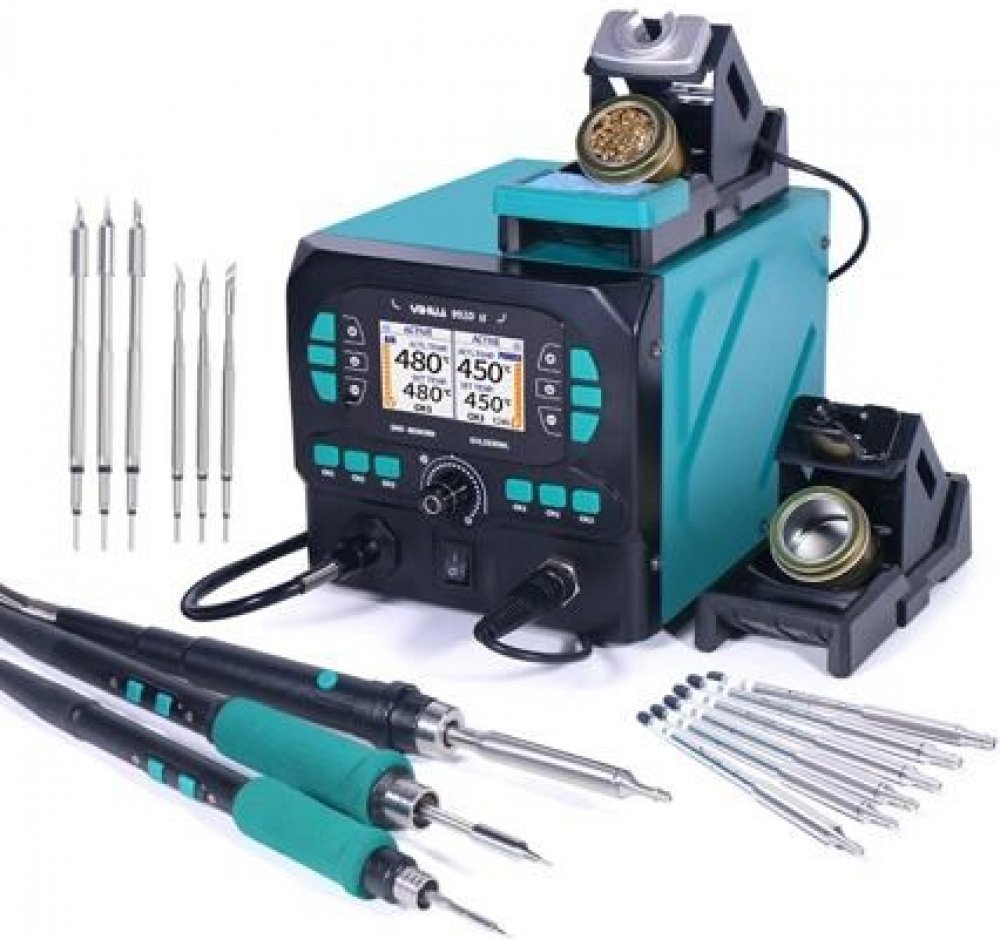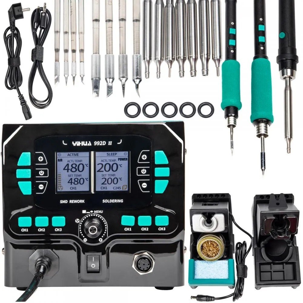 Rozsah dodávky: YIHUA 992D-II 2-IN-1 přesná horkovzdušná pájecí stanice a pájecí stanice s páječkou a přesnou horkovzdušnou pistolí, držák pro horkovzdušnou pistoli, držák na páječku, topný článek C210 I/K/SI; 8 W575 horkovzdušné trysky (0,5/1,0/1,5/2,0/2,0/2,0/2,0/2,0/2,0/2,0/2,0/2,0/2,0/2,5/3,0. /3,5/4,0 mm) Počet kanálů: 3 3. přednastavené kanály Teplotní rozsah 1: 90°C~450°C/194°F~842°F (pájecí stanice) Teplotní rozsah 2: 100 °C ~ 480 °C / 212 °F ~ 896 °F (horkovzdušná přepracovací stanice) Hrot pro zemní odpor