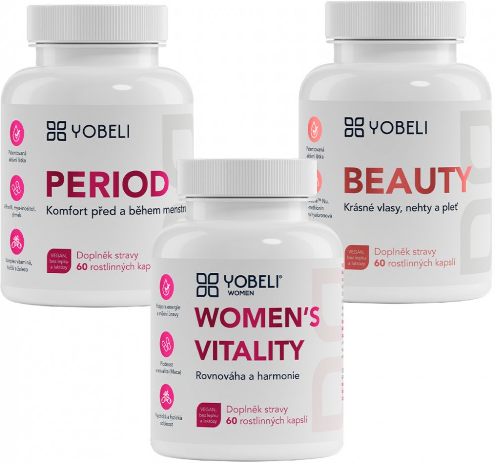 Yobeli Akční balíček pro ženy Krása a rovnováha doplňky stravy Women's vitality 60 kapslí Beauty 60 kapslí Period 60 kapslí