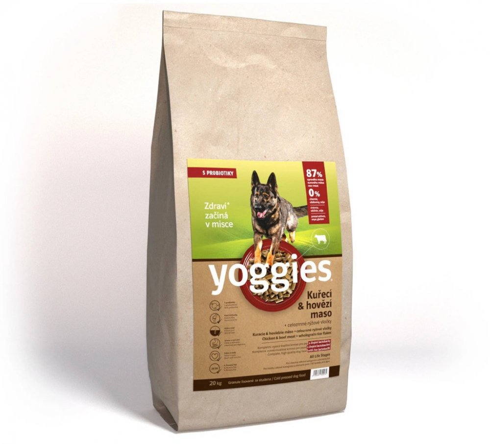 Granule bez lepku, sóji a chemie, plné přírodních vitamínů, bylinek a vyváženého obsahu kuřecího i hovězího masa. Yoggies granule lisované za studena pejskům skvěle chutnají a jsou mimořádně zdravé pro jejich trávicí systém. Jsou vyráběny pouze z kvalitních surovin, které se jen suší, melou a lisují. Obsahují 87% kvalitního syrového masa (před sušením) a díky tomu jsou špičkou na trhu. Laktobacily podporují imunitu i zdravý trávicí trakt, který také granule prebioticky čistí od usazenin. Jsou výborně stravitelné a nenabobtnají. Tím jsou pro psa snazší k trávení.