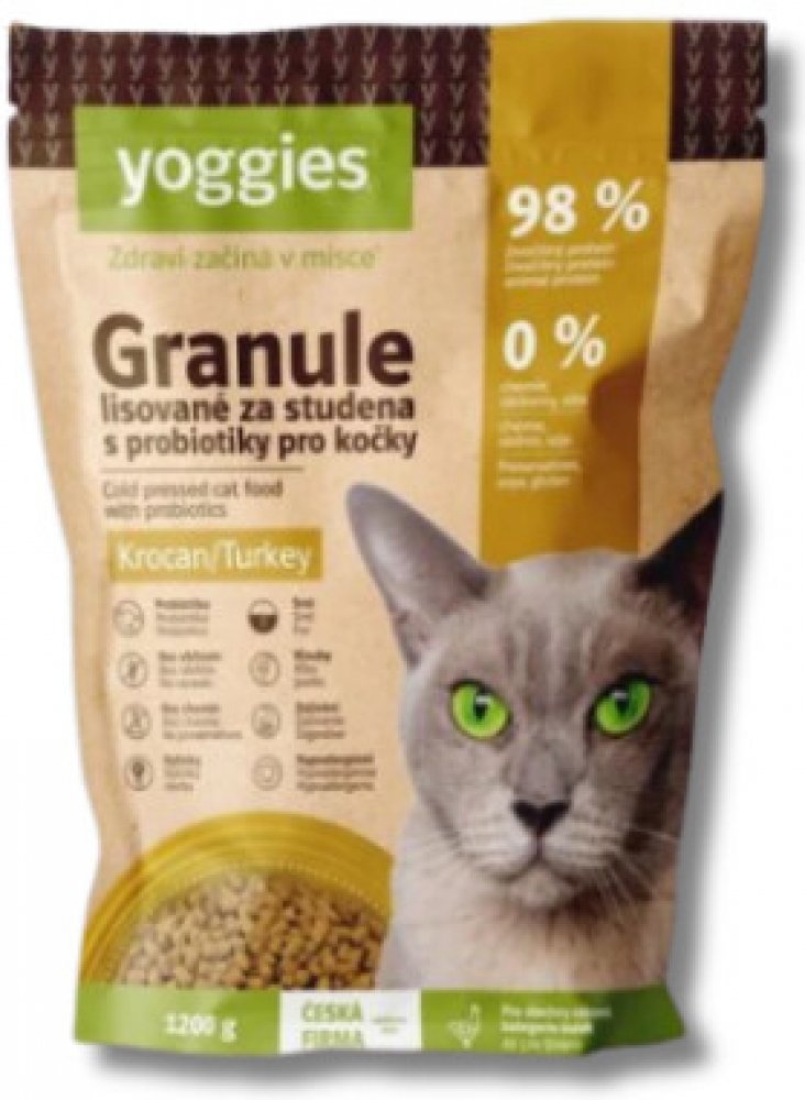 Yoggies granule pro kočky s krocaním masem, lisované za studena obsahují jedinečná probiotika pro podporu imunity i celkového zdraví koček. Jsou alternativou hlavně pro kočky krmené masem a mohou být používány jako kvalitní forma plnohodnotného kočičího jídelníčku, který může být občas zpestřen syrovým masem.