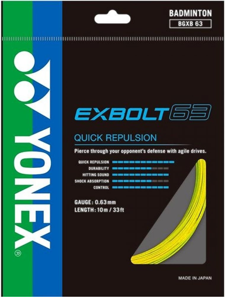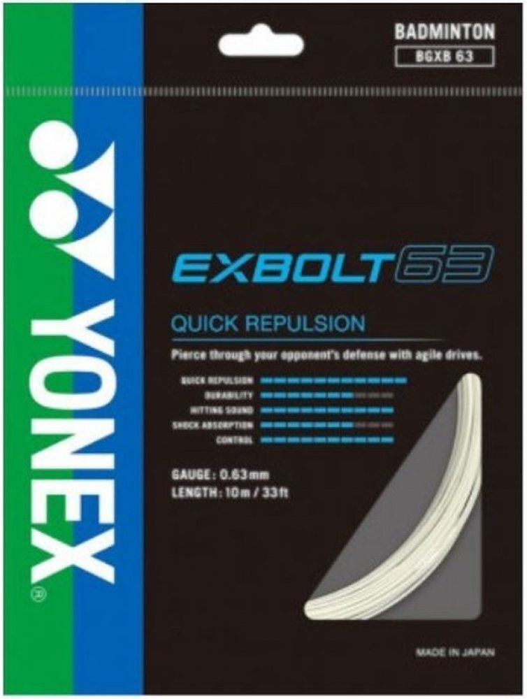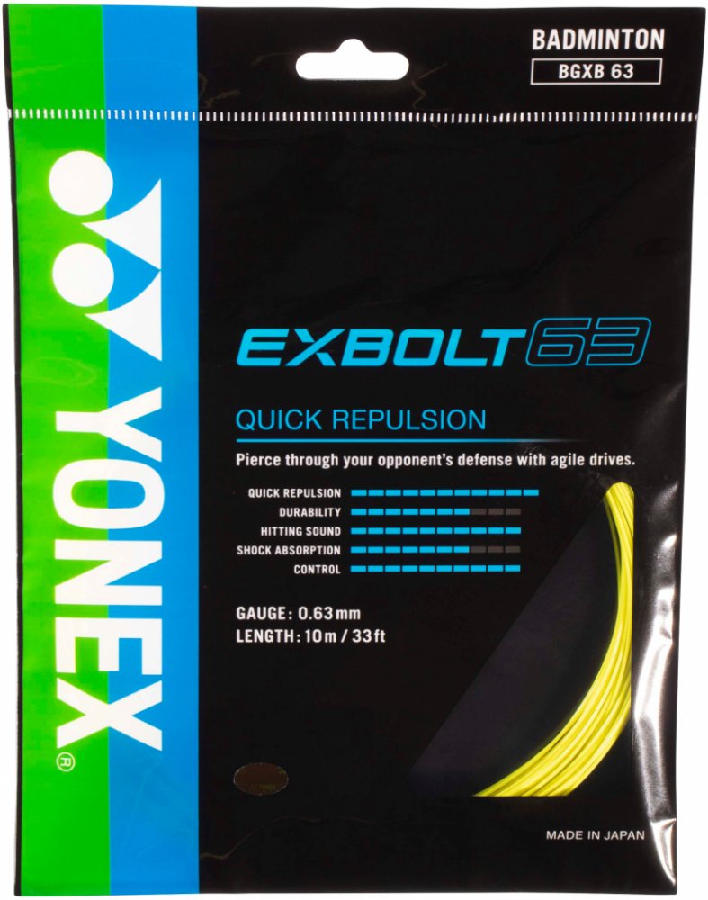Firma YONEX představuje zcela novou řadu badmintonových strun EXBOLT. Prvním výpletem této zbrusu nové série je EXBOLT 63, který je vyroben pomocí nového patentovaného materiálu FORGED FIBER. Díky němu nový EXBOLT 63 přináší kombinaci odolnosti, ideálně tenkého průměru struny a skvělé repulze.