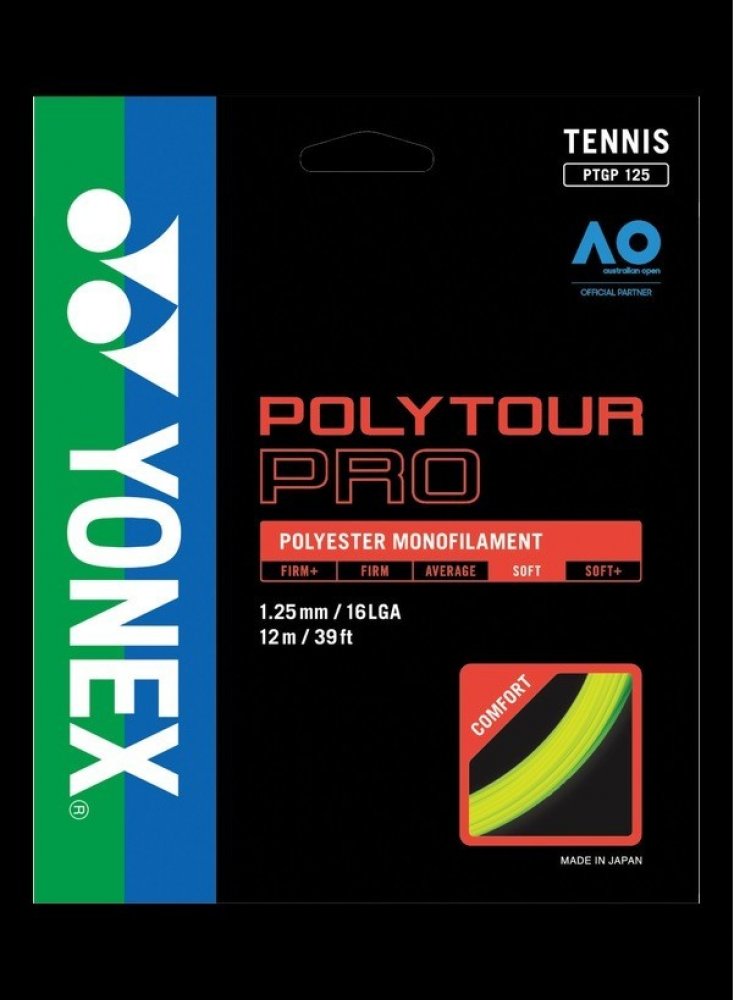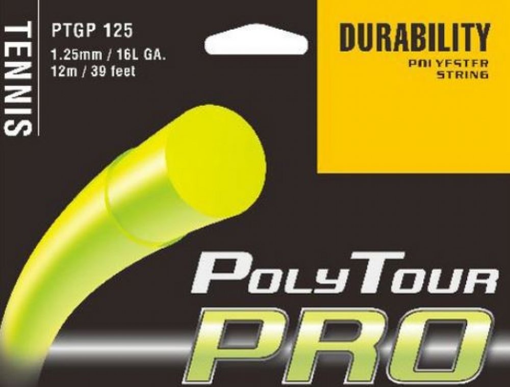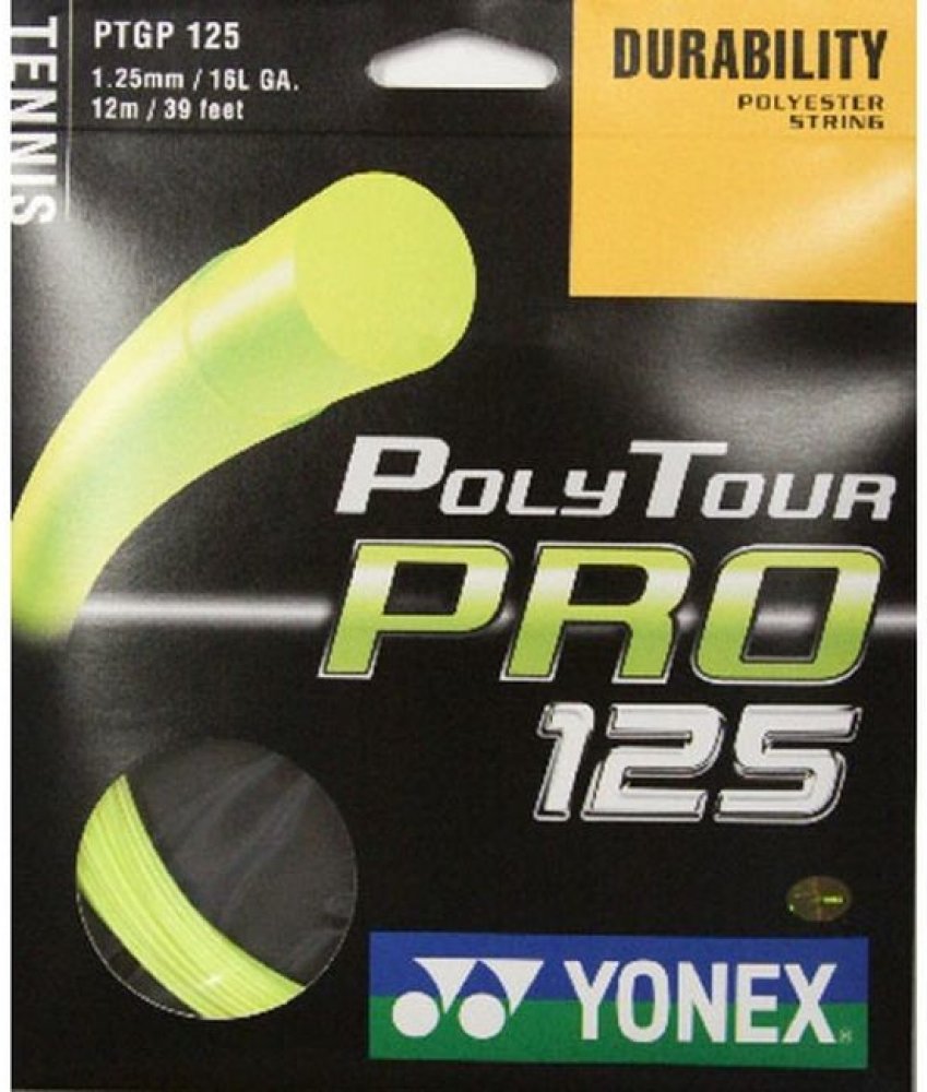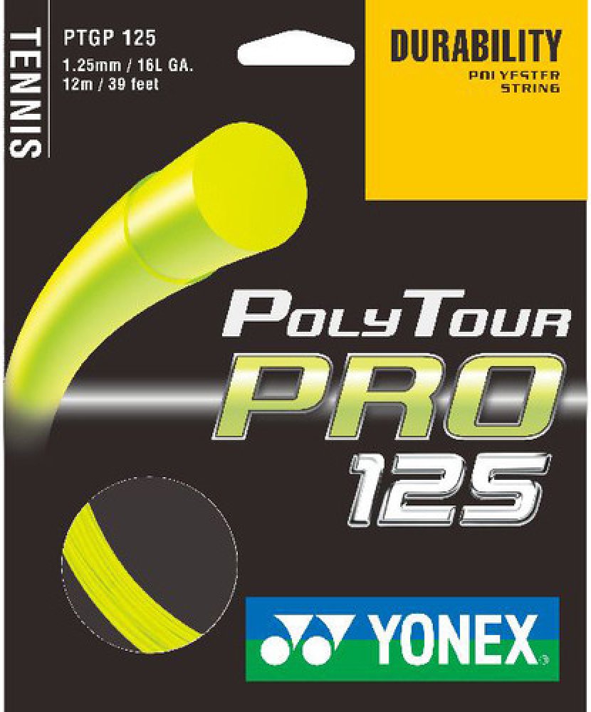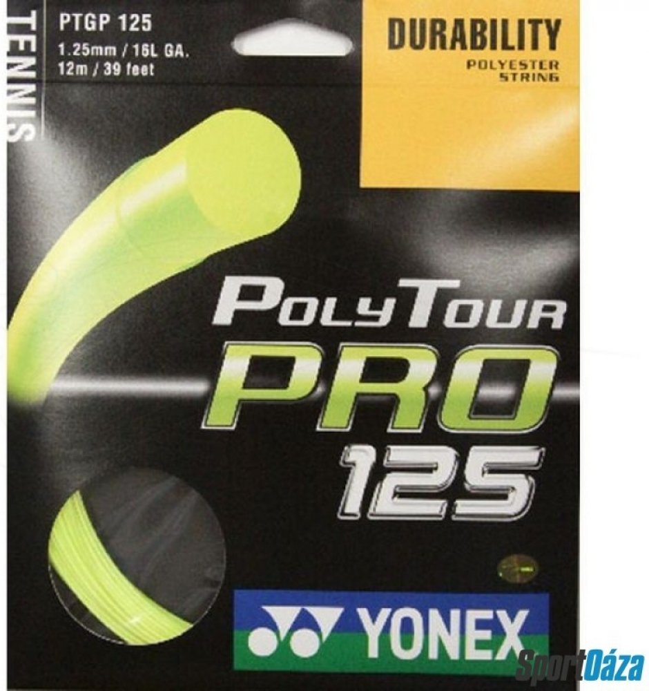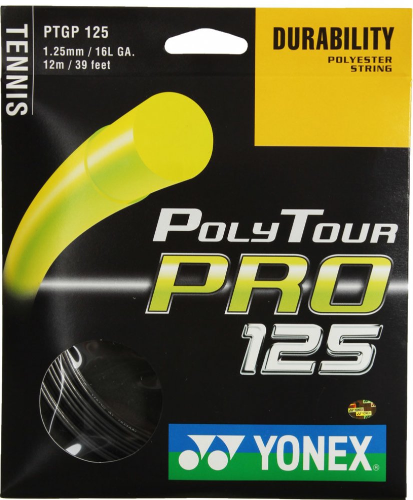 Tenisový výplet Poly Tour Pro 125 je novinkou firmy Yonex pro rok 2011. Tento polyesterový monofilamentní výplet vyniká svojí dlouhou trvanlivostí. Má monofilamentní jádro s polymer-polyesterovou charakteristikou. Na jeho vývoji se podíleli špičkoví profesionální hráči, kteří jej nyní s oblibou používají. Tato trvanlivá polyesterová struna přináší hráčům razanci při dobré kontrole svých úderů. Náš bestseller.