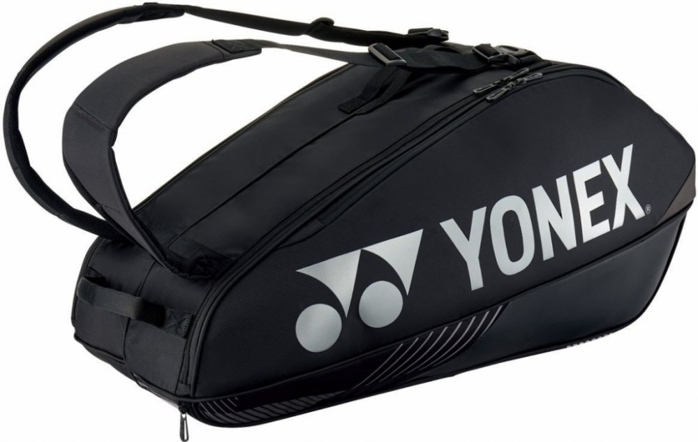 Tenisová taška Yonex Pro Racquet Bag 6 pack - černá Má dvě hlavní komory na zip. Samostatná komora na obuv nebo mokré oblečení. Dvě vnější kapsy na příslušenství, z nichž větší má vnitřní síťovaný organizér. Dva nastavitelné a pohodlné popruhy s možností odepnutí. Držadlo pro postavení tašky na výšku a pro přenášení v ruce. Taška je určena na 6 raket.