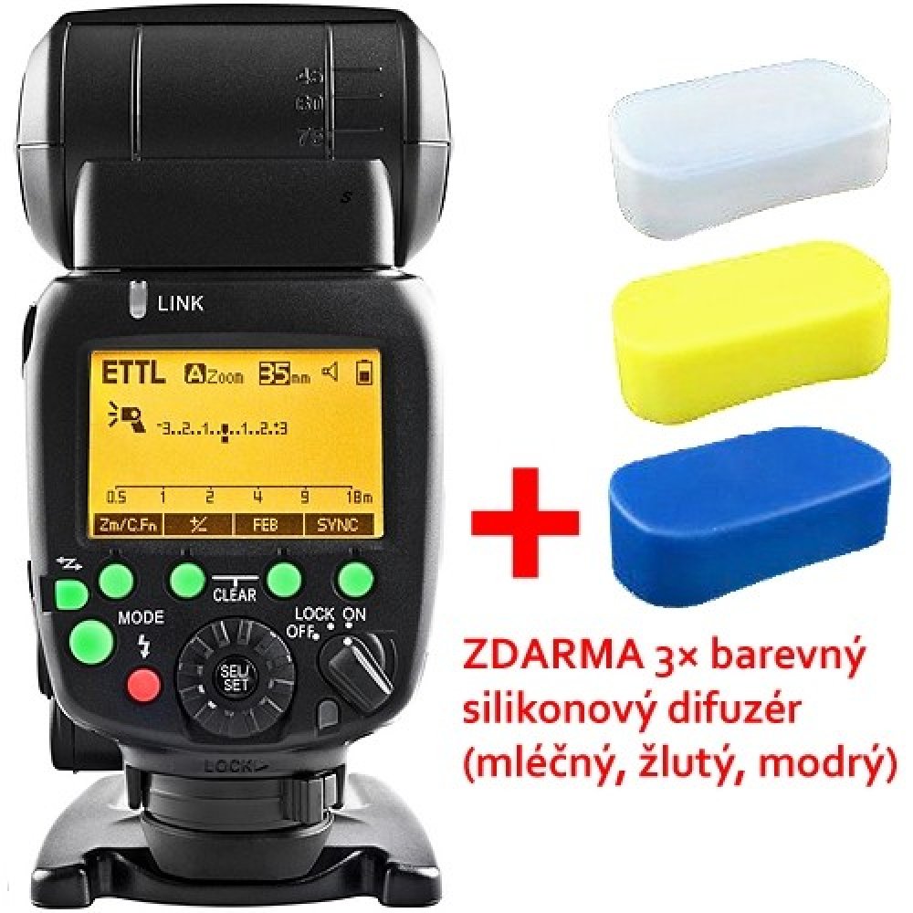- Možnost manuálního nastavení výkonu, funkce S1 a S2 pro odpalování zábleskem od jiného blesku