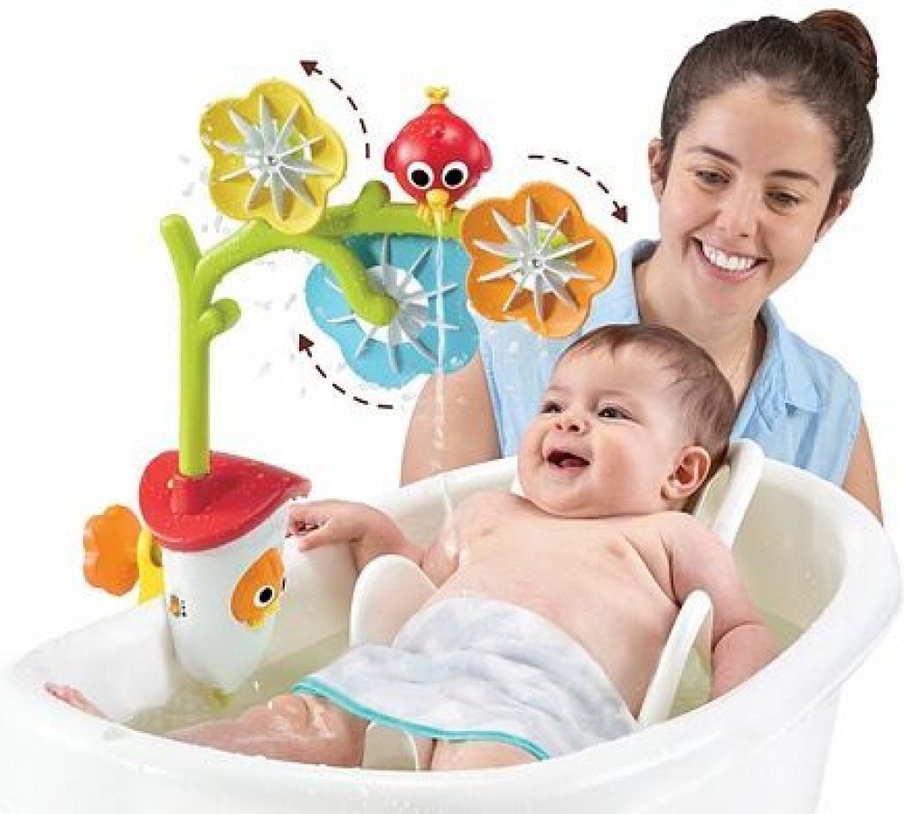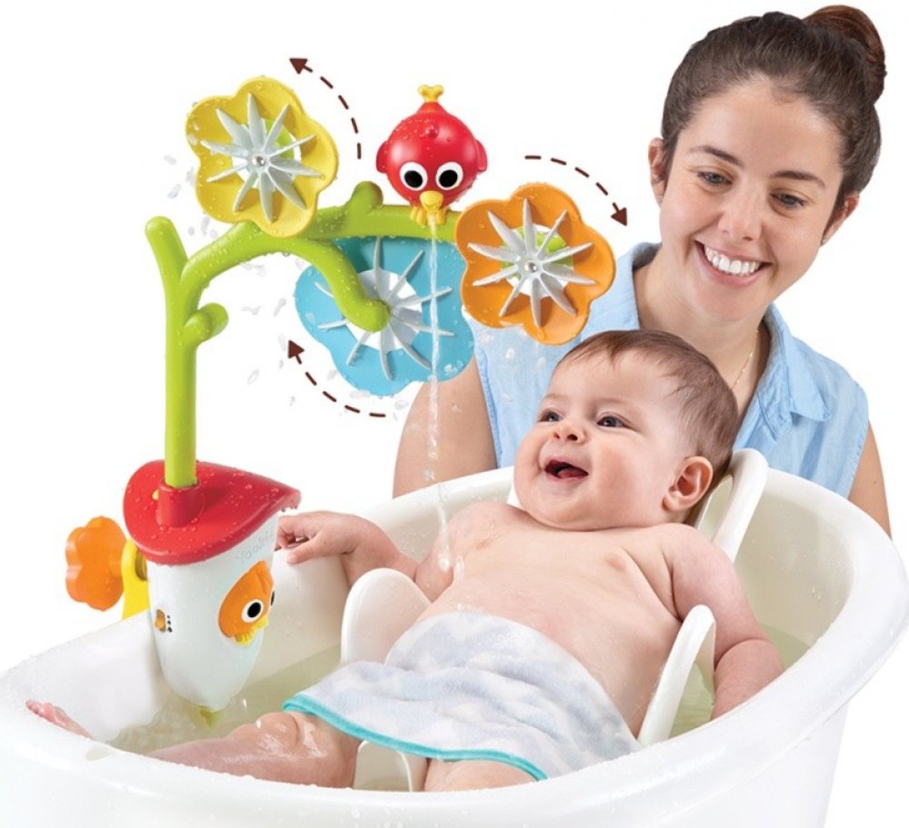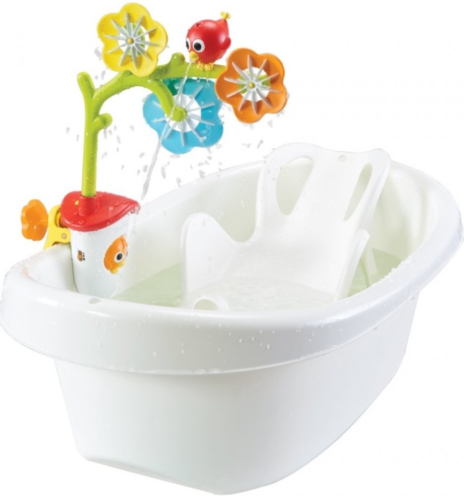Ptačí domeček s bateriovým čerpadlem, Senzorický oblouk s otáčecími květinami a ptáčkem, Kryt baterií se svorkou pro dětské vaničky, Kryt baterií s přísavkami pro běžné vany