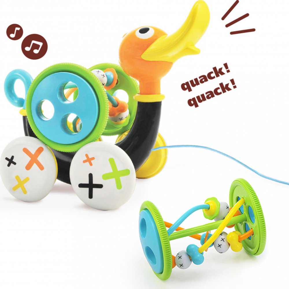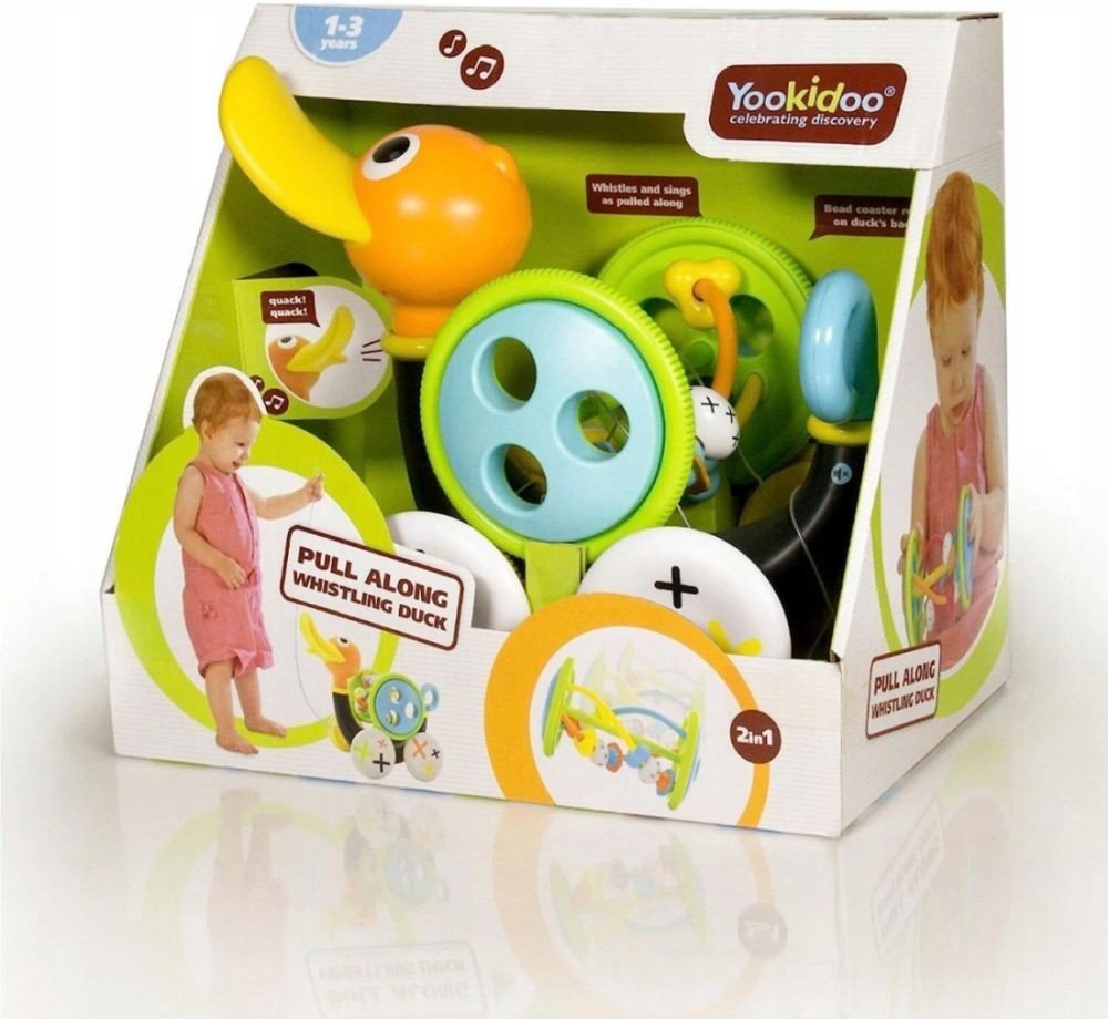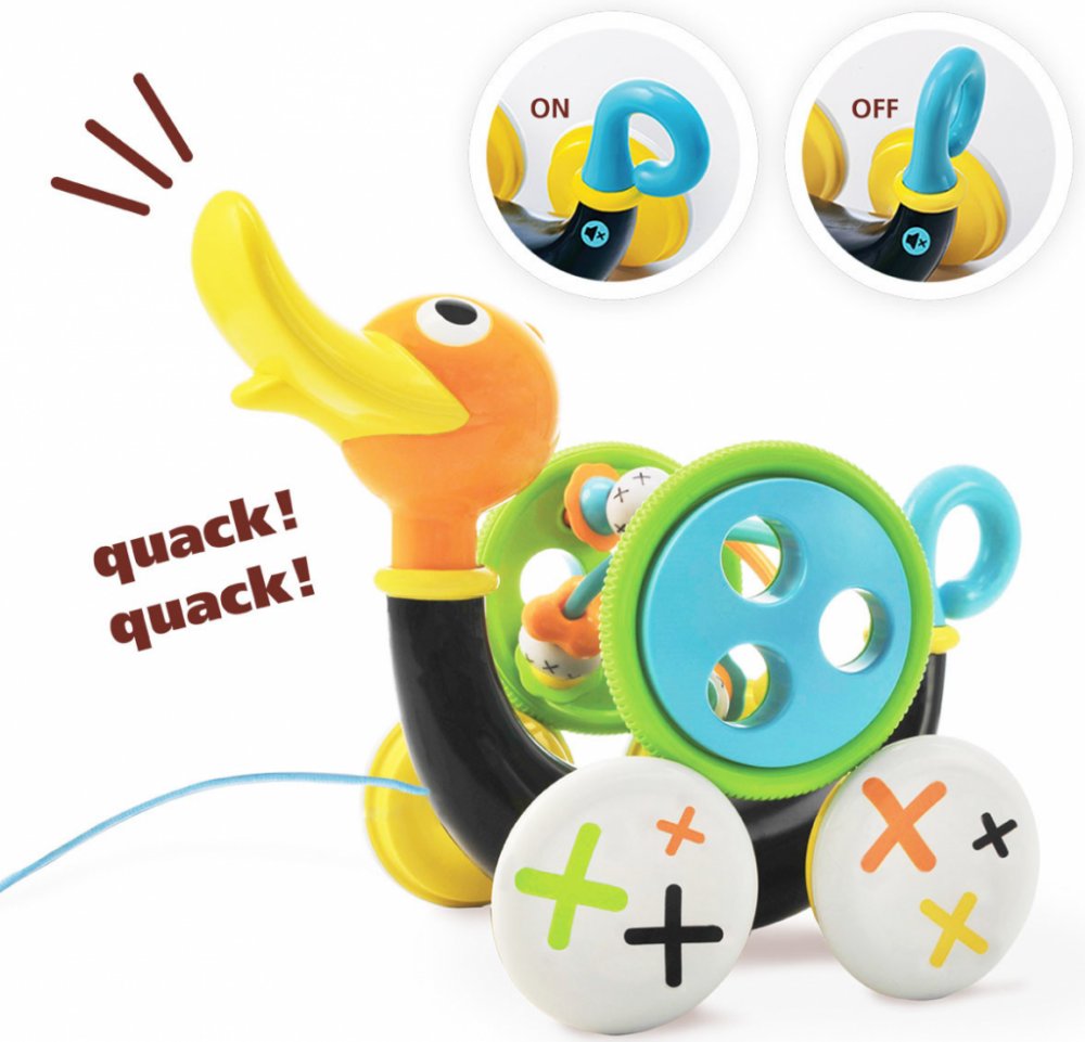 Interaktivní hračka v podobě tahací plastové kachny. Kachna při tažení vydává zvuky, které děti zaujmou a pobídnou je k aktivitě. Je-li kachna ponechána bez dozoru, sama na sebe upozorní. Zvuky je možné také vypnout. Hračka podporuje rovnováhu s koordinací a pobízí dítě k samostatné chůzi.