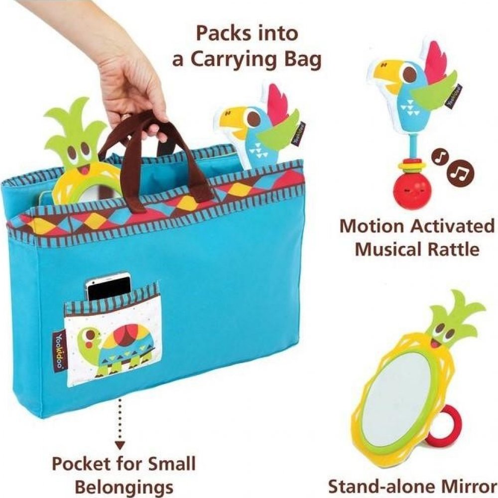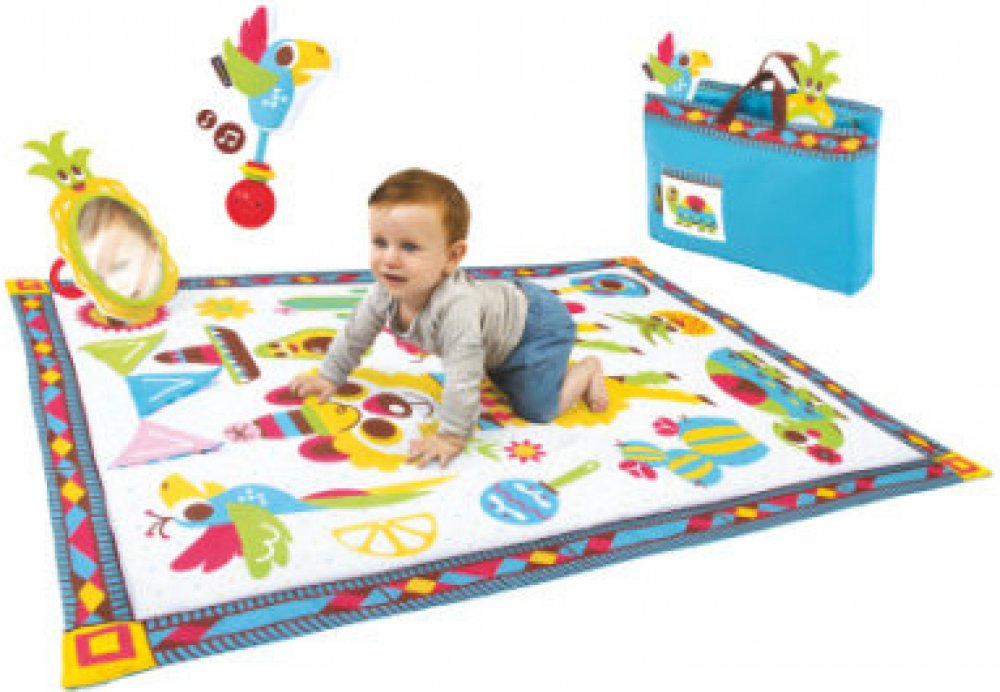 Velká hrací deka umožňuje dítěti pohybovat se, převrátit se a prozkoumat jeho okolí, čímž se prodlouží doba hry na bříšku. Ilustrace s barevnými kontrasty stimulují zrak a kognitivní dovednosti. Velké zrcátko podporuje opakované zvedání hlavičky a rozvíjí svaly krku a ramen, které jsou důležité pro vývoj dítěte. Šustivé vlajky pod sebou ukrývají obrázky a zároveň stimulují hmat i sluch. Hudební chrastítko, které po zatřesení vydává zábavné zvuky učí dítě vztahu příčina-následek.