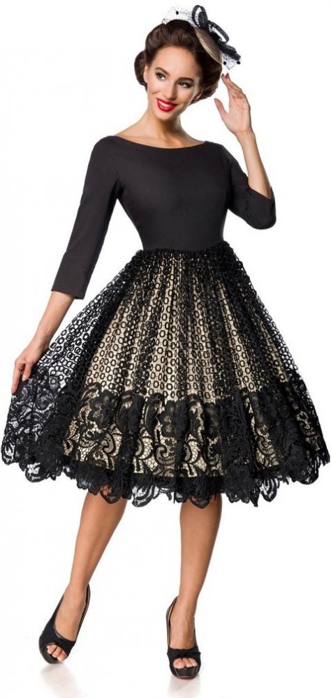 Krajkové dámské společenské šaty v populárním retro stylu, mají lodičkový výstřih a tříčtvrteční rukáv. Od pasu dolů je bohatá, kolová sukně v dvojvrstvém vzhledu - černá krajka na béžovém bavlněném podkladu. Pro pohodlné oblékání se zapínají na skrytý zip, který je umístěn uprostřed zadního dílu. Šaty jsou ušité z vysoce kvalitního, lehce pružného materiálu. Střih skvěle sedí téměř každé postavě a působí velice žensky a elegantně. Pro luxusní, bohatý vzhled sukně, doporučujeme doplnit spodničkou, s níž docílíte správného efektu. V těchto šatech se budete cítít neobyčejně a vyjímečně. Můžete si je vzít na jakoukoliv společenskou událost jako je ples, večírek, divadlo, večeře nebo schůzka v kavárně - všude tam, kde chcete udělat ten správný dojem. Nejvyšší kvalita od německé značky Belsira. Spodnička není součástí produktu. Materiál: vnější tkanina - 70% polyester, 25% bavlna, 5% elastan ; vnější sukně - 80% polymid, 20% bavlna ; podšívka - 85% bavlna, 15% elastan Dovoz: Německo