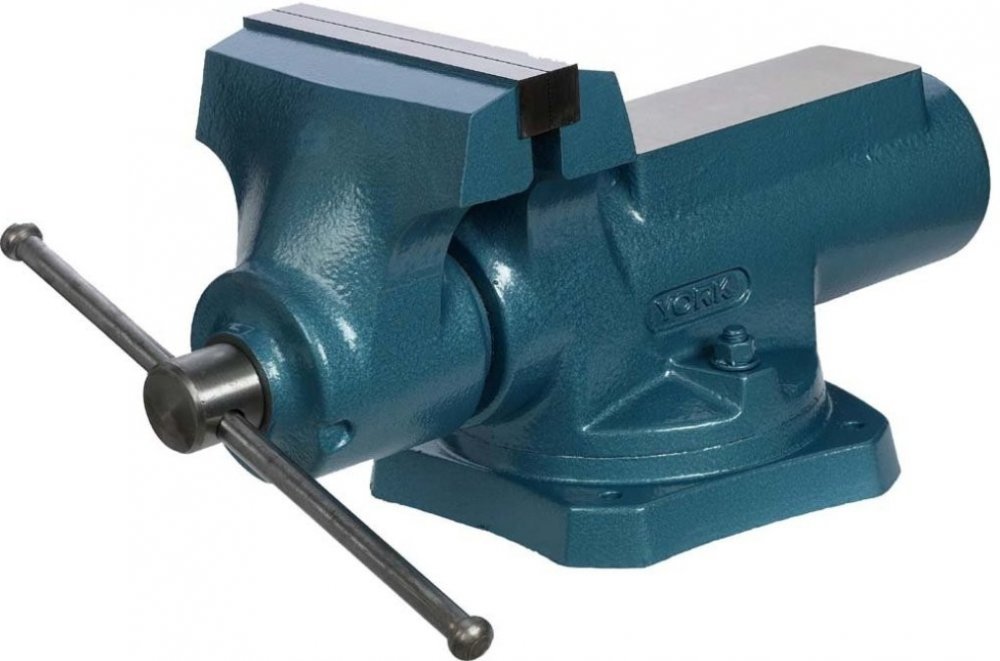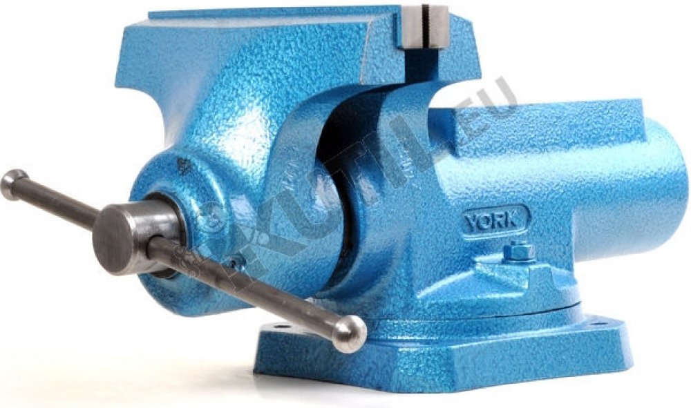 Svěrák York Titan 250 T masivní litinový svěrák pro náročné použití se základovou deskou umožňující otáčení svěráku ±360° kovadlina 70x150 mm čelisti z vysoce kvalitní oceli kaleny na 45 HRC ± 5 HRC s čelistmi na trubky upevnění k základové desce šrouby hmotnost: 45 kg šířka čelistí: 250 mm délka upnutí: 200 mm