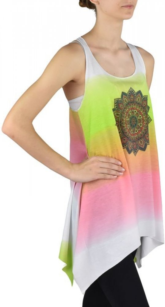 Popis: volný střih, široká ramínka vzadu stažená, kulatý výstřih, potisk, rovný spodní lem, na bocích ve spodní části rozparekMateriál: 65% polyester, 35% bavlnaRozměry:Šířka přes prsa: 45 cmŠířka v pase: 55 cmDélka: 70 cm