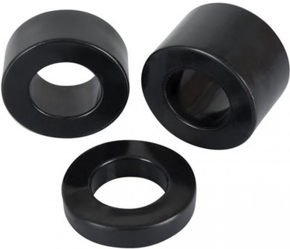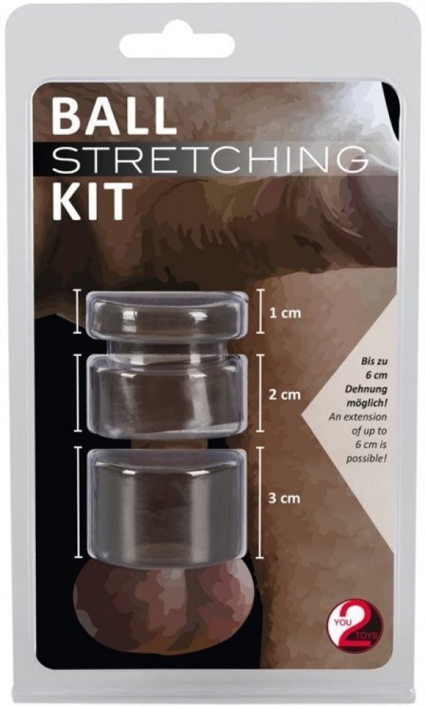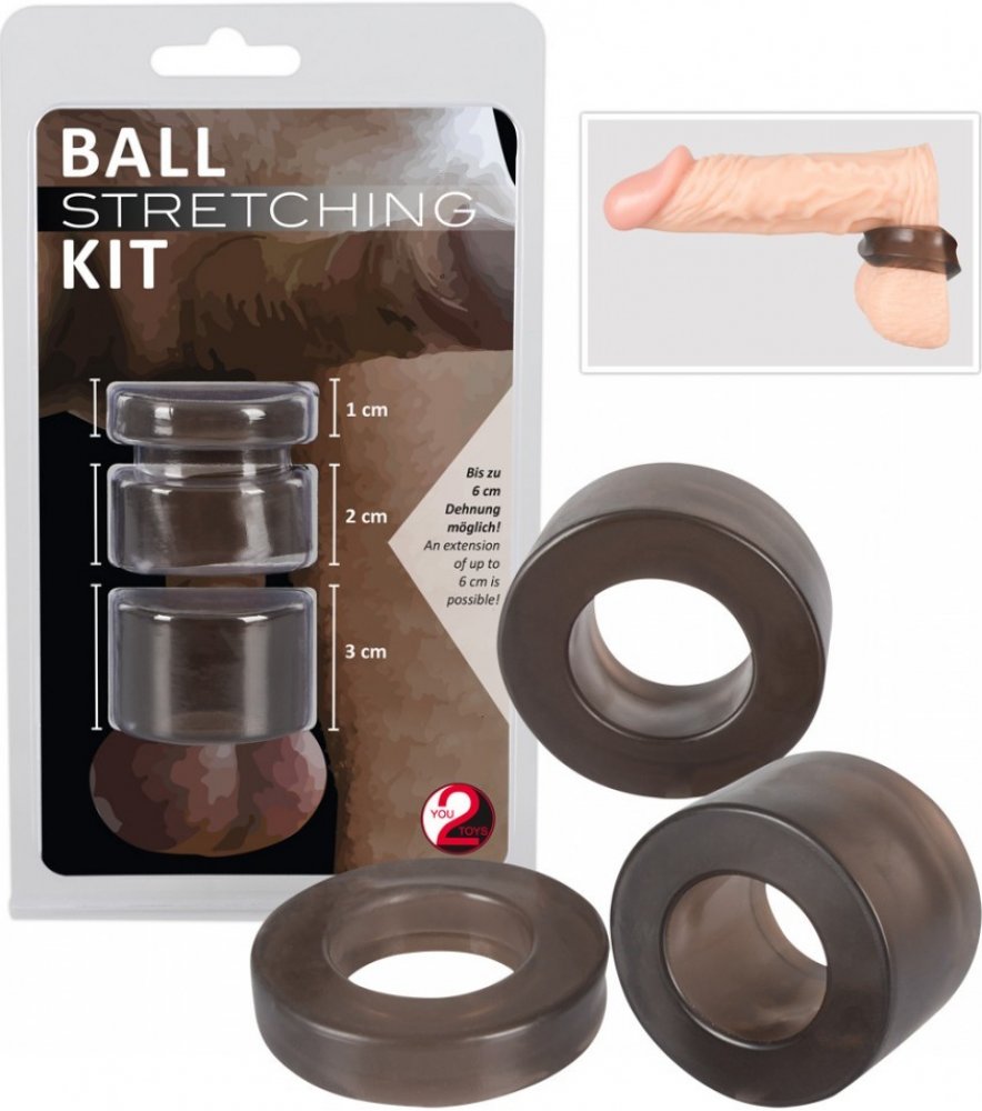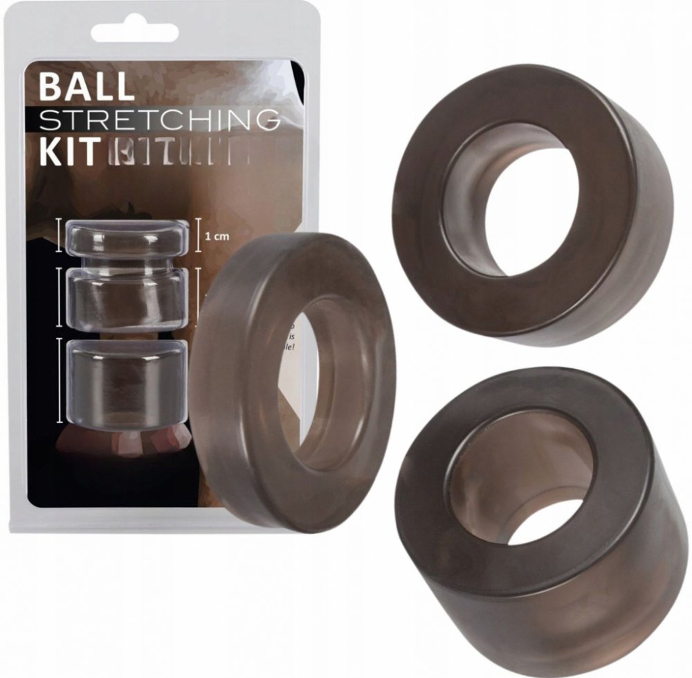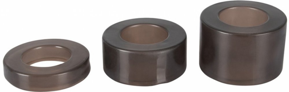 Set of three smoke-coloured rings for stretching the scrotum. The smallest ring is put around the scrotum, at the top of the testicles. The testicles get pushed down and the scrotum gets stretched. After a while, the other two rings with different widths can be used to stretch the scrotum and over time it will get longer. Ring width: 1 cm, 2 cm und 3 cm. All the rings have an inner
