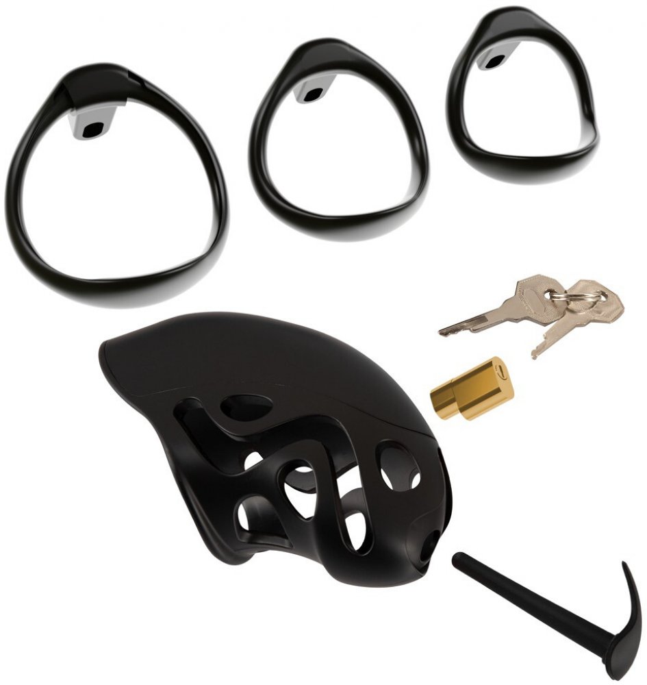 Pohodlná anatomicky tvarovaná pomůcka pro dlouhodobější nošení, která se přizpůsobí tělu a umožní pevné, ale příjemné uchycení díky vyměnitelným kroužkům. Otevřený design dovoluje běžnou hygienu i močení, volitelný silikonový nástavec přidá další rozměr prožitku a kovový zámek zajistí spolehlivou kontrolu.
