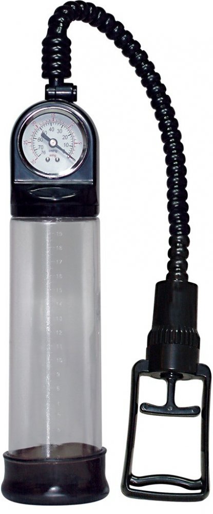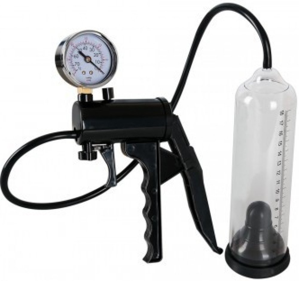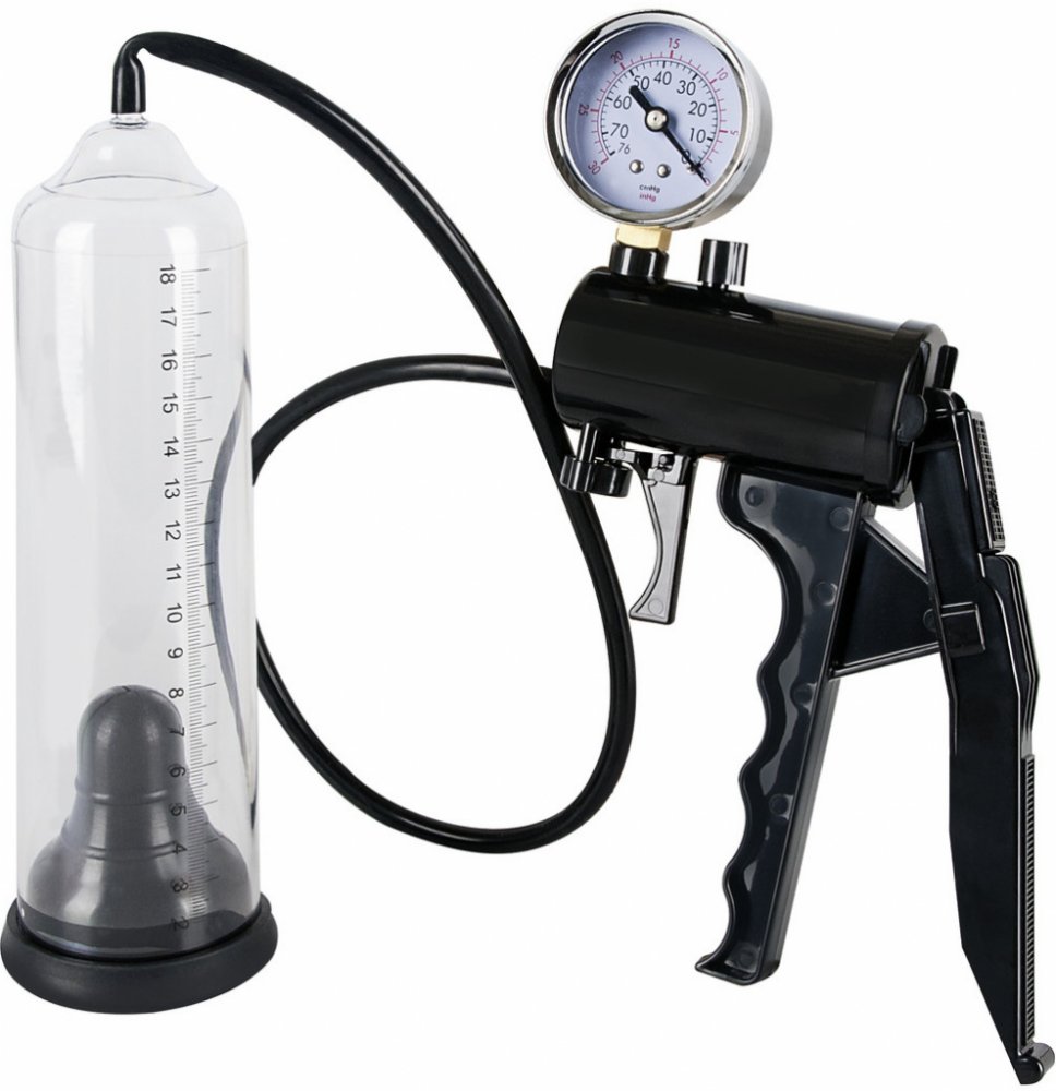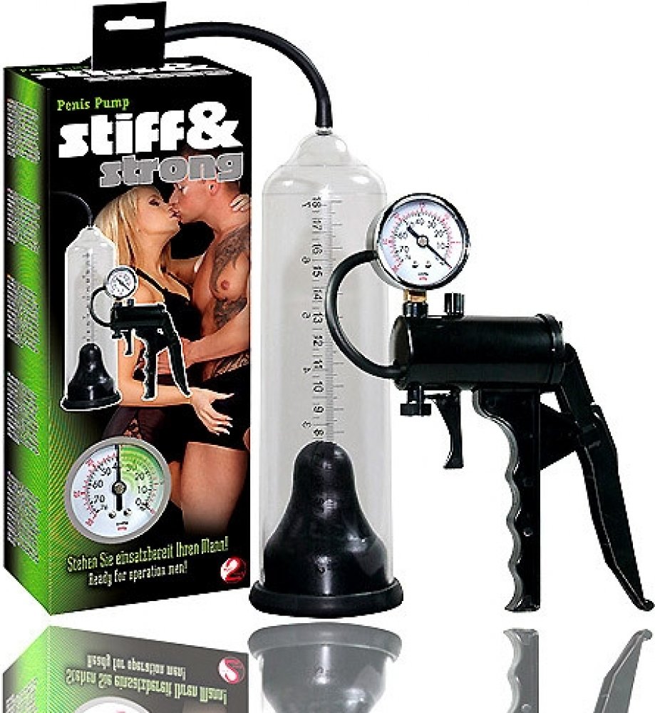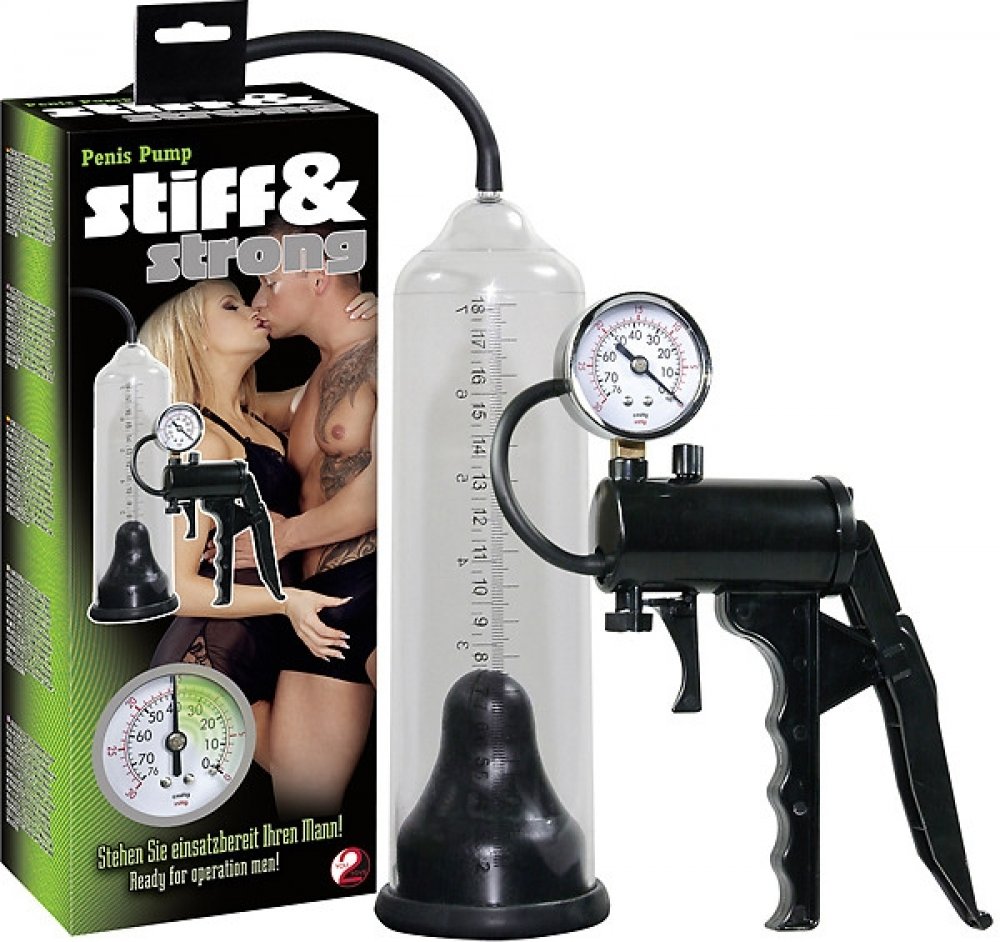 Vakuová pumpa pro náročné muže s měřičem tlaku a stupnicí. Vakuová pumpa Stiff&Strong je kvalitní vakuová pumpa s transparentním cylindrem a pistolovým odsáváním. Pumpa má ukazatel tlaku a stupnici délky na které si můžete změřit zvětšení vašeho penisu během používání. Stupnice je namalována až do 18 cm! Použivání vakuové pumpy pomůže dodat bezprostřední sílu vašemu penisu a efektivní mužnou sílu vašemu sebevědomí. Stačí penis zasunout pružnou a kluzkou latexovou manžetou do transparentního cylindru, kde se mu dostane dostatečného podtlaku, který nejenže pomůže erekci, ale ještě navíc zvětší jeho velikost. Po použití stačí pumpu lehce omýt pod tekoucí vodou. V transparetním a černém provedení.
