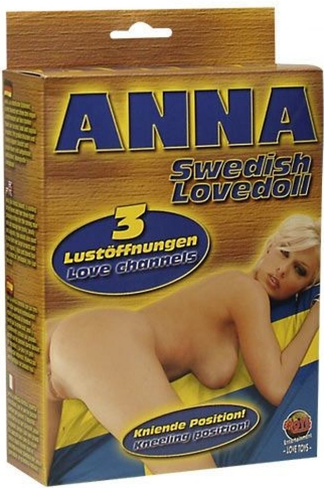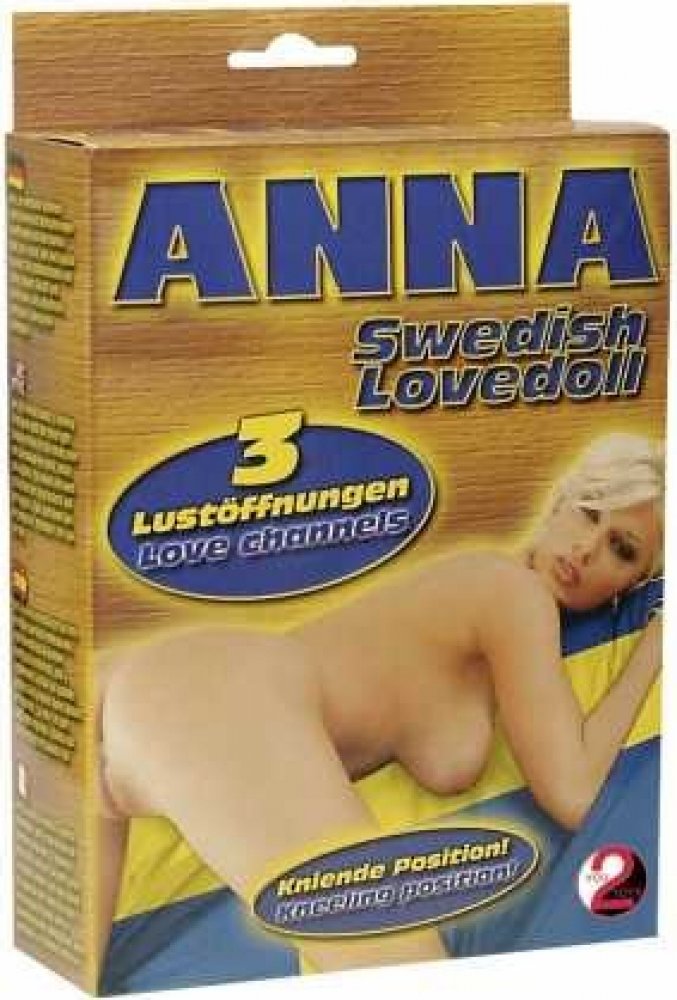 Návod k použití. Nafukovací panna Anna je typická švédská kráská se třemi otvory: ústa, vagína a análek. Má velká pevná prsa s bradavkami a realistický obličej s blond vlasy. Panna je v životní velikosti a v klečící poloze.