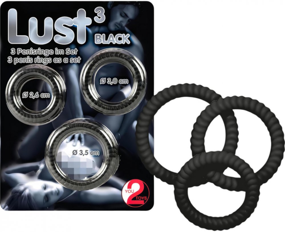 Odolné a pružné silikonové kroužky pro dlouhotrvající a pevnou erekci!Proč je to super?Tři různé velikosti (2,6 cm, 3 cm, 3,5 cm) pro individuální zážitekSpeciální drážkovaný povrch pro intenzivnější stimulaciFlexibilní silikonový materiál, který je bezpečný a šetrný k pokožcePřináší delší a příjemnější zážitky oběma partnerůmLze používat společně nebo jednotlivě - záleží jen na vaší fantaziiNa co si dát pozor:Před i po použití důkladně opláchněte vlažnou vodou a jemným mýdlemPoužívejte jen gel na vodní bázi, abyste ochránili silikonové kroužkyPokud je pocit příliš těsný, přestaňte používat, ať se vyhnete nepříjemnostemObsah balení:1x silikonový kroužek o průměru 2,6 cm1x silikonový kroužek o průměru 3 cm1x silikonový kroužek o průměru 3,5 cmVlastnosti produktu:Materiál: silikonBarva: černáPrůměry: 2,6 cm, 3 cm, 3,5 cmPovrch: drážkovaný, stimulačníDoporučení k čištění: Důkladně omyjte jemným mýdlem a vlažnou vodou, opláchněte a nechte volně uschnout. Doporučujeme také použití speciálního čistícího prostředku (8718627520062) - lze objednat zvlášť.