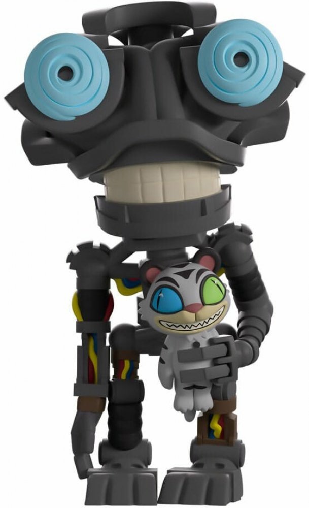 We thought we were done with M2 at Murray's Costume Manor, but they've proved that was only the beginning with their Youtooz debut! Standing at 4.9 inches tall with bright blue spiraling eyes peering out from their grey face, which has thick wires wrapping around to form a wide skull, pale teeth almost form a smile as long arms and legs hang from the ball joints of their narrow endoskeleton. With dark piping and bright red, yellow, and blue wires covering thin limbs, they hold their precious White Tiger doll in a clamped hand as the other dangles to the side. The exterior of their packaging seems to be standing alone in a dark bedroom that has clouds and stars on its striped walls. While the interior puts them right in the center of a maroon and yellow circus tent with long curtains and strings of lights, this then continues onto the protective sleeve where their figure can be seen through the large clear window at the packaging's front. This collectible ships in a matte, embossed, protective outer sleeve and a custom-sized plastic protector for maximum protection during shipping.