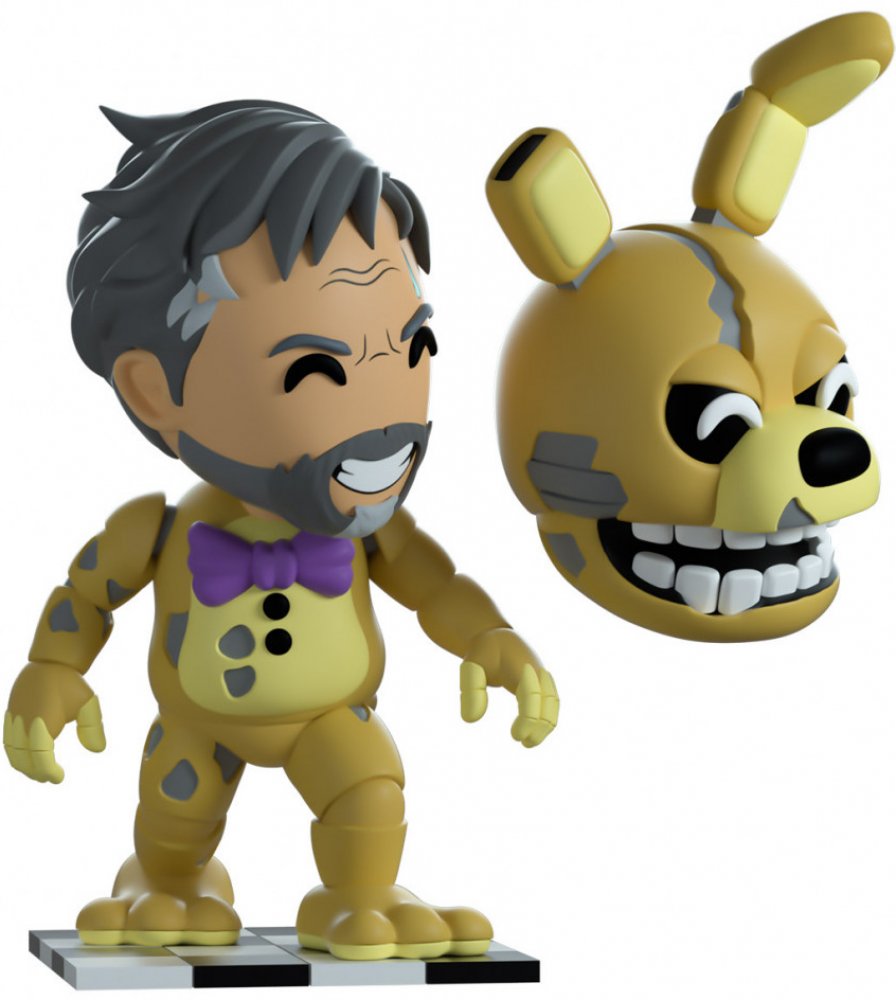 It's true, he always comes back! And Youtooz is powerless to stop him! But wait, is it the Yellow Rabbit or William Afton? It's both! And you can decide which as this figure comes with 2 interchangeable heads! One of the Yellow Rabbit with menacing glowing white eyes and baring his teeth as fur falls away to reveal a cold animatronic skull with one long ear curving forward as...