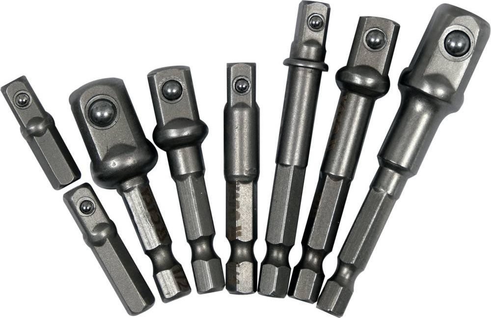 Sada se skládá z 8 adaptérů 1/4", 3/8" a 1/2", každá velikost má různé délky adaptéru 25, 30, 50, 65 a 72 mm.