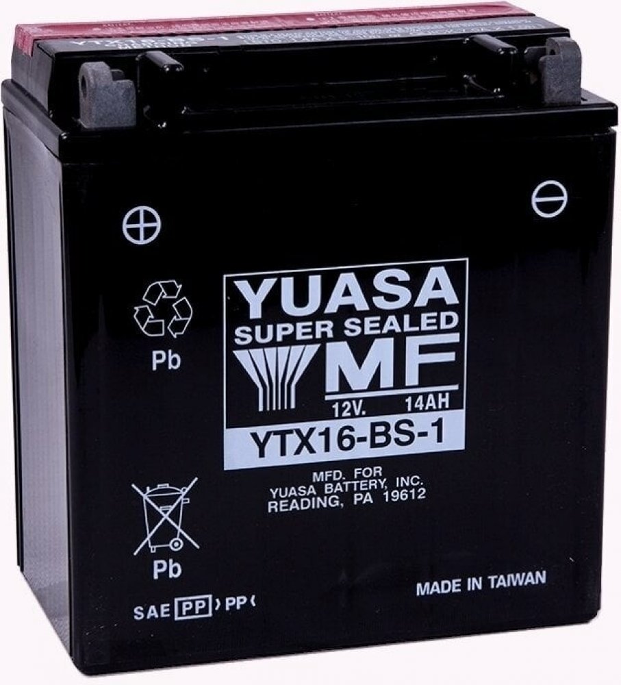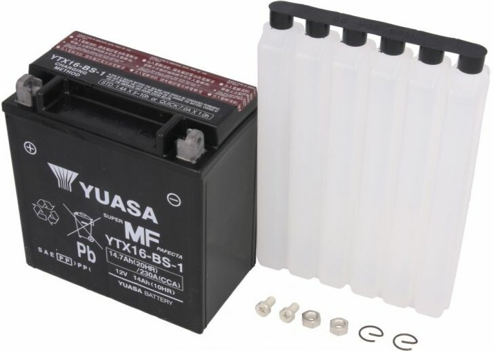 YTX16-BS-1 12V-14Ah bezúdržbový VRLA motoakumulátor YUASA. Akumulátory MF mají o 30% vyšší startovací výkon.