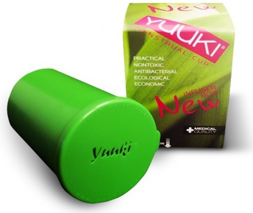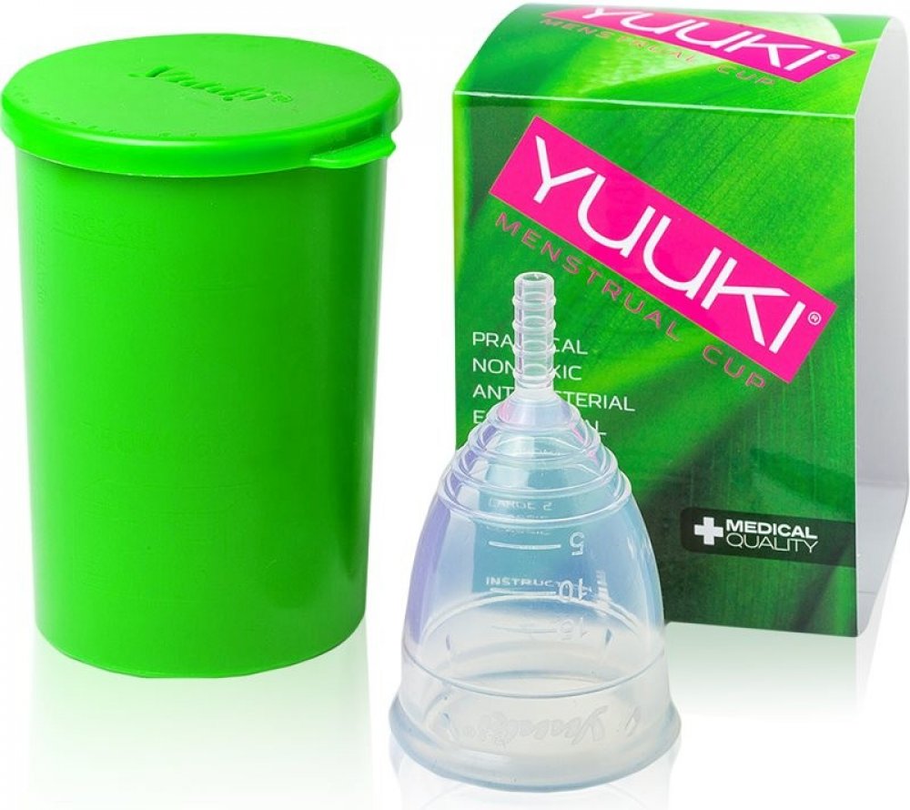 Menší menstruační kalíšek Yuuki v měkčí variantě z čirého lékařského silikonu nejvyšší kvality. Součástí balení je i zelený sterilizační kelímek.