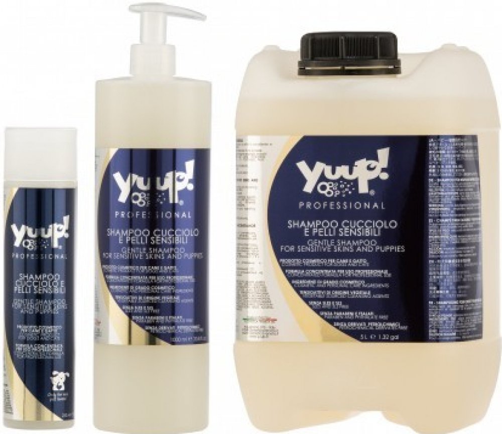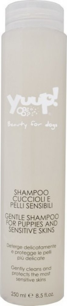 Jemný šampon pro štěňata a citlivé psy Yuup obsahuje kombinaci zklidňujících a ochranných látek pro hydrataci a hebkou srst jako například mléčnou bílkovinu, zelený čaj a extrakt z Angelicy s antioxidačními a uklidňujícími účinky.