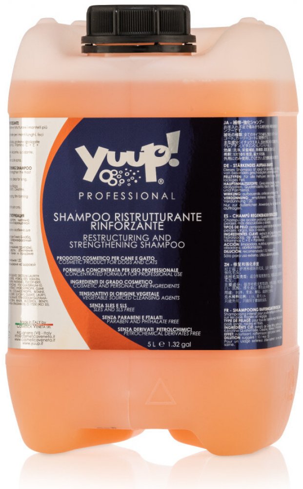 Restrukturalizační a posilující šampon pro psy Yuup je formulován s přísadami, jako jsou kvaternizovaný keratin, kreatin a vitamín C + E + panthenol ve vysoké koncentraci. Přírodní extrakt z Ginkgo biloba podporuje mikrocirkulaci pokožky pro lepší výživu od kořínků, zatímco hydrolyzované rýžové bílkoviny restrukturalizují a vytváří ochrannou vrstvu s rozjasňujícími účinky.--- Návod k použití: Nařeďte (doporučené ředění 1:10 maximální až 1:20, v případě použití neředěného přípravku nehrozí žádné kontraindikace) a aplikujte na mokrou srst zvířete, vmasírujte do pokožky a poté opláchněte vlažnou vodou. Je-li potřeba, postup opakujte. Následně použijte vhodný kondicioner nebo masku Yuup. Vyvarujte se kontaktu s očima. V případě zasažení očí vypláchněte vlažnou vodou. nepoužívejte v případě onemocnění kůže. Příklady vhodných plemen: Afghánský chrt, Shih Tzu, Border kolie, Čau-čau Obsah výživných složek, které usnadňují rozčesávání a dodávají srsti splývavý efekt. (Vyjádření na stupnici 0 až 3, kdy 0 = nejlehčí efekt, ideální, když potřebujete objem až 3 = největší výživa, nejlehčí česání, ideální, když potřebujete splývavý efekt nebo extra výživnou péči) : 3