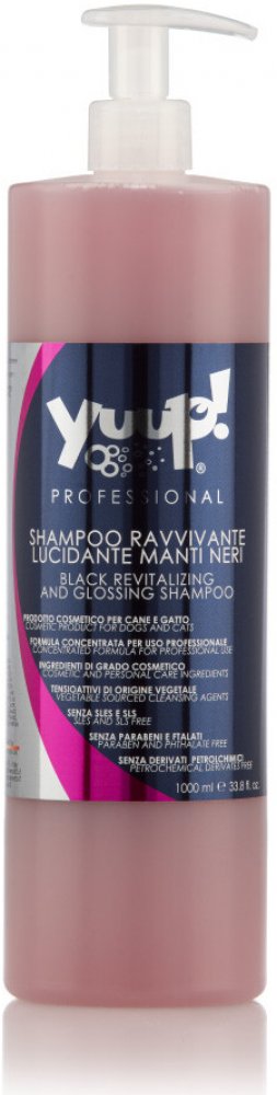 Tento šampon hluboce čistí pokožku a chrání srst působením kvarternizovaného keratinu, který obnovuje sílu a objem chlupu. Komplex Kreatinu a Vitaminů C + E + Panthenolu silně zvlhčuje pokožku a dodává lesk srsti. Specifické složky s odkazem na přírodní keratin vlasů odolný během oplachování zvyšuje intenzitu přirozené barvy a chrání před působením slunce a jiných škodlivých vlivů. Přírodní výtažky ze slupek vlašského ořechu a slézu neutralizují teplé tóny srsti pro intenzivnější černou barvou s tmavými odlesky a hydratují kůži. Hydrolyzované rýžové proteiny rozjasňují srst a usnadňují rozčesávání. Vhodné i pro kočky s černou a tmavou srstí. neobsahuje barvy.--- Návod k použití: Nařeďte (doporučené ředění 1:10 maximální až 1:20, v případě použití neředěného přípravku nehrozí žádné kontraindikace) a aplikujte na mokrou srst zvířete, vmasírujte do pokožky a poté opláchněte vlažnou vodou. Je-li potřeba, postup opakujte. Následně použijte vhodný kondicioner nebo masku Yuup. Vyvarujte se kontaktu s očima. V případě zasažení očí vypláchněte vlažnou vodou. nepoužívejte v případě onemocnění kůže. Příklady vhodných plemen: Baset, Dobrman, Pudl, Jezevčík, Německý pinč, Border kolie Obsah výživných složek, které usnadňují rozčesávání a dodávají srsti splývavý efekt. (Vyjádření na stupnici 0 až 3, kdy 0 = nejlehčí efekt, ideální, když potřebujete objem až 3 = největší výživa, nejlehčí česání, ideální, když potřebujete splývavý efekt nebo extra výživnou péči) : 2