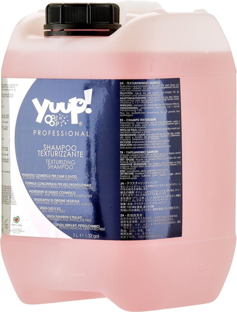 Yuup! Professional Texturizing Shampoo je profesionální šampon pro psy a kočky. Je vyvinutý tak, aby dodal srsti strukturu a objem a učinil ji lehkou a plnou života. Doporučuje se pro jakoukoli hladkou nebo kudrnatou srst vašeho domácího mazlíčka. Vyrobeno z přírodních složek. Vhodně obsahuje výtažky z prosa, obilovin, kukuřičných jader a meruňkový olej, které jsou bohaté na živiny, posilují a hydratují srst. Kromě toho je šampon obohacen o kvartérní keratin, kreatin, vitaminy C, E a panthenol, které mají na srst regenerační, obnovující a hydratační účinky.Šampon dokonale čistí srst, aniž by ji vysušoval. Komplex látek dodává texturu a tvar zplihlému, neživému a objemnému kožichu. Srst se stává hustší, silnější a pružnější.Výtažky z prosa, obilných a kukuřičných zrn. Tyto přírodní výtažky jsou bohaté na živiny, které pomáhají posílit srst a dodávají jí lesk. Jsou také známé pro své hydratační vlastnosti, které pomáhají udržovat srst zdravou a lesklou.Meruňkový olej je bohatý na vitaminy A a E, které jsou klíčové pro zdraví kůže a srsti. Pomáhá hydratovat kůži, zabraňuje jejímu vysušování a šupinatění a dodává srsti hebkost a lesk.Kvartérní keratin je forma keratinu, která byla upravena tak, aby snadněji pronikala do srsti a kůže. Pomáhá zpevňovat srst, zlepšuje její pružnost a zabraňuje lámavosti.Kreatin je přírodní aminokyselina, která pomáhá posilovat strukturu srsti, dodává jí objem a plnost. Je také známý pro své hydratační vlastnosti, které pomáhají udržovat srst zdravou a lesklou.Vitamíny C, E a panthenol: Tyto vitaminy jsou klíčové pro zdraví kůže a srsti. Vitamin C je silný antioxidant, který pomáhá chránit kůži a srst před poškozením volnými radikály. Vitamin E pomáhá hydratovat kůži a srst, zabraňuje jejich vysušování a loupání. Panthenol, známý také jako provitamín B5, pomáhá hydratovat kůži a srst, dodává jim hebkost a lesk.Vlastnosti Yuup! Šampon pro úpravu textury:na bázi přírodních složekDodává srsti strukturu a objemČiní srst lehkou, pružnou a plnou životahydratuje, vyživuje a chrání kůži a srstobnovuje a regeneruje srstDokonale vyživujenezatěžuje srstPro všechny hladké a kudrnaté srsti psů a kočekobsahuje přírodní výtažky z prosa, obilovin, kukuřičných jader a meruňkový olej.Obohaceno o kvartérní keratin, kreatin, vitaminy C, E a panthenol.určeno pro profesionální použití v kadeřnických salonechkoncentrát 1:20Návod k použití:Šampon nařeďte v poměru 1:10 až 1:20 podle potřeby. Poté naneste na mokrou srst a jemně vmasírujte, dokud se nevytvoří pěna. Nechte několik minut působit a poté důkladně opláchněte.O značce: Yuup! je italská značka senzační kosmetiky pro domácí zvířata, kterou stále více uznávají a oceňují ošetřovatelé, chovatelé a zákazníci po celém světě. Nabízí tři produktové řady.1. Profesionální řada - vytvořená pro ošetřovatele a chovatele, kteří očekávají tu nejlepší kosmetiku a výsledky.2. Řada Home - jedná se o nejkvalitnější kosmetiku vyráběnou pro všechny, kteří hledají výrobky nejvyšší kvality za přijatelnou cenu. Ideální pro domácí použití.3. Fashion line - profesionální produkty pro konečnou úpravu srsti, nepostradatelné pro výstavy a přehlídky. Najdete zde parfémy, lesky a další nezbytné přípravky.