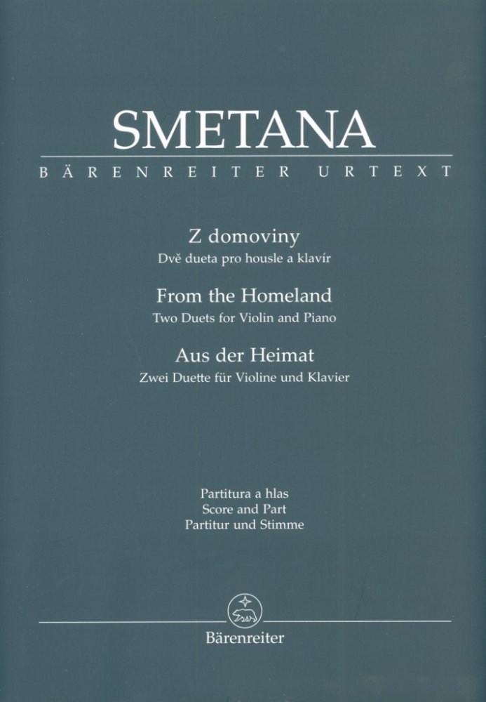 Titul Dvě dueta pro housle a klavír, vydaná společně pod poetickým názvem Z domoviny, spadají dobou vzniku (1880) do závěrečného tvůrčího období Bedřicha Smetany (1824-1884). Ohluchlý skladatel v té době žil v ústraní u rodiny své dcery Žofie v myslivně v Jabkenicích u Mladé Boleslavi, kam se přestěhoval v roce 1876. Dueta vznikla na popud knížete Alexandra Thurn-Taxise, syna majitele panství, který sám byl dobrým houslistou, a poprvé byla vydána v Urbánkově nakladatelství v Praze v roce 1881. Slovy skladatele jsou dueta ve snadnějším stylu, určená spíše pro domácí potřebu než k přednesu na koncertě, aniž by to však bylo vyloučeno, v typickém národním nápěvu, ale s mými vlastními melodiemi . Notový text nového vydání vychází ze Studijního vydání děl Bedřicha Smetany, svazek XV: Komorní skladby. Partitura a hlasy. Formát: IX, 22 S. - 31,0 x 24,3 cm.