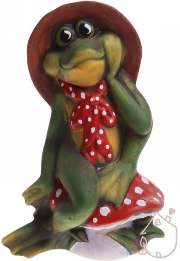 Keramická žába, která sedí na muchomůrce může být na vaší zahradě po celý rok.