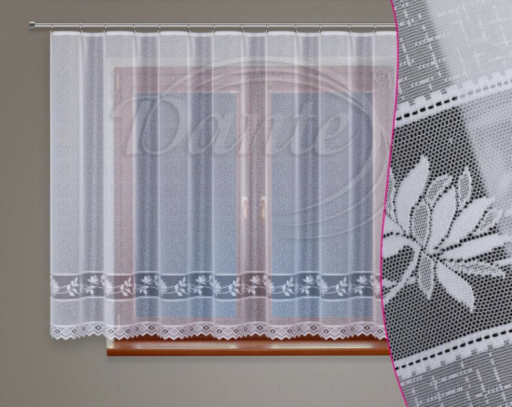 Horní část záclony je bez vzoru. Ve spodní části je hladký pruh s květinovým vzorem.