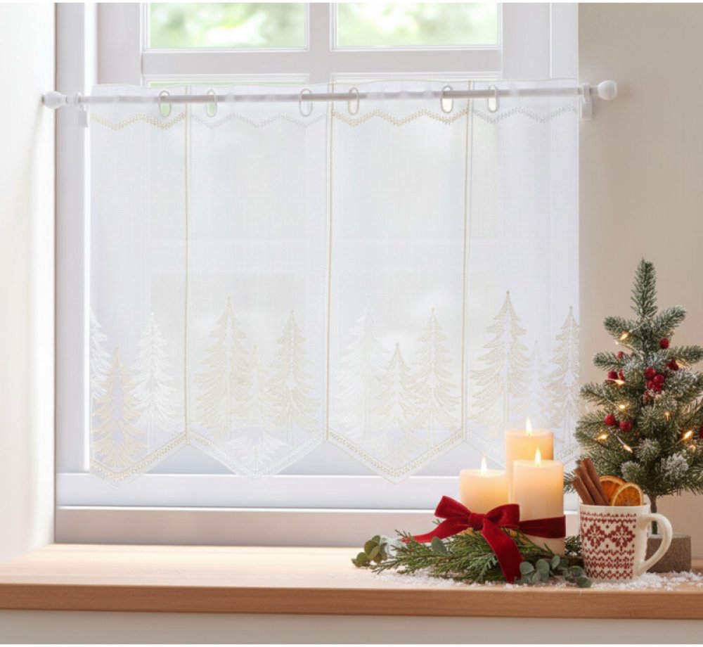 Záclona markizeta, Stromečky vyšívané, bílo-zlaté 60 cm Tahle krátká vánoční záclona je ideální pro vytvoření sváteční atmosféry ve vaší kuchyni nebo jídelně. Je vyrobena z průsvitné bílé látky a zdobena elegantní bílo-zlatou výšivkou s motivy stylizovaných jehličnatých stromů/vánočních stromků.