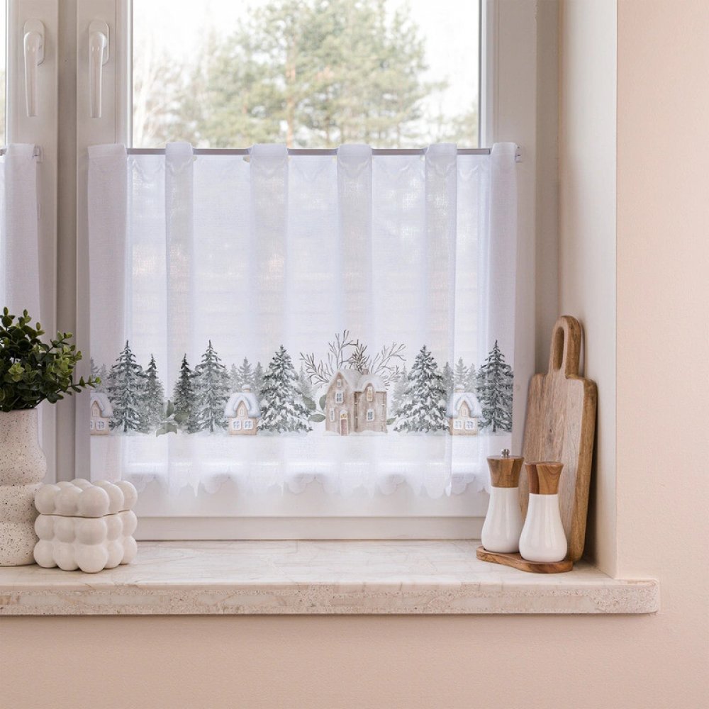 Působivý vánoční potisk: Záclona je zdobena okouzlujícím potiskem zasněžených stromečků a útulných domků, které vytvoří idylickou zimní scenérii přímo ve vašem okně. Každý pohled na ni vás přenese do pohádkového světa Vánoc.
