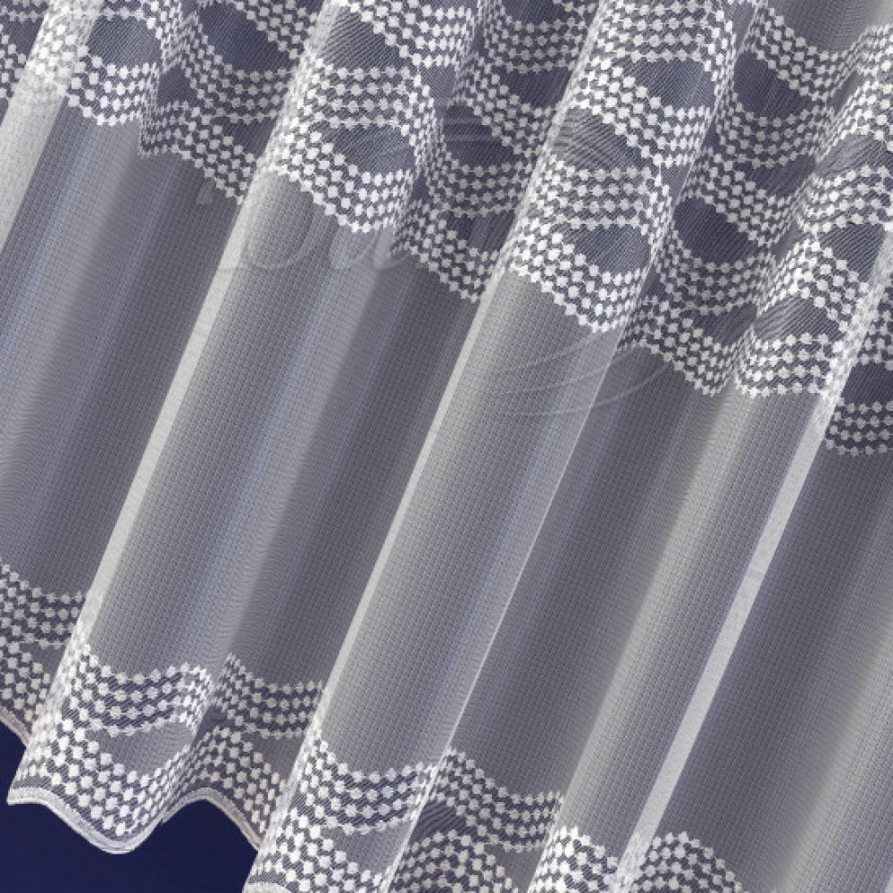 Záclonu zdobí elegantní vyšívané vlnky tvořené malými kouličkami, výšivka je bílá se stříbrnou nitkou.