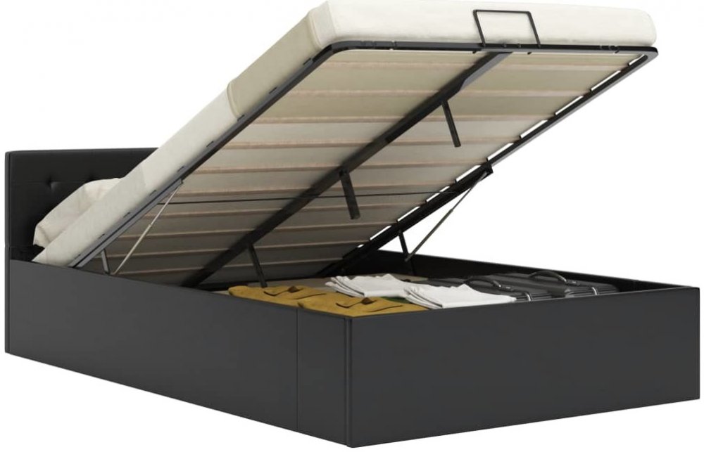 S tímto hydraulickým rámem postele z umělé kůže získá vaše ložnice okamžitě působivý a moderní vzhled! Tato manželská postel se vyznačuje jednoduchým, ale stylovým designem a pevnou konstrukcí, protože je vyrobena z pevné a odolné MDF desky.Tato čalouněná postel promění nevyužitý prostor pod matrací v úložný prostor s dostatkem místa pro uložení oblečení, prostěradel, přikrývek atd. Díky hydraulickému plynovému zvedacímu mechanismu je zvedání matrace hračkou. Lamelový rošt po zvednutí stojí ve vzpřímené poloze, takže obě ruce jsou volné pro vyjmutí nebo uložení věcí pod ním.Práškově lakovaný ocelový rám a překližkové lamely přispívají k robustnosti a odolnosti postele. Čalounění z lesklé umělé kůže je příjemné a snadno se čistí. Tento produkt se snadno montuje. Tento ložnicový nábytek je vhodný pro matraci o rozměrech 140 × 200 cm.Upozorňujeme, že součástí dodávky je pouze rám postele. Matrace není součástí dodávky.Barva: černáMateriál: čalounění z Imitace kůže + překližkové lamely + ocelový a MDF rámCelkové rozměry: 211 x 148 x 73 cm (d x š x v)Vhodný rozměr matrace: 140 x 200 cm (š x d) (matrace není součástí dodávky)S úložným prostoremSnadné zvedání díky mechanismu plynových tlakových pružinMateriál: bavlna: 4%, polyester: 2%, PVC: 94