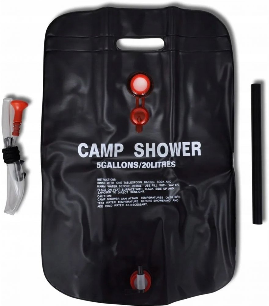 Tato kempingová sprcha vám poskytne uklidňující sprchu po dlouhé cestě při kempování nebo pěší turistice. Odolný materiál: Solární sprcha je vyrobena z vysoce kvalitního PVC materiálu, je odolná vůči povětrnostním vlivům a má pevnou konstrukci. Snadné použití: Je vybavena ventilem, který umožňuje velmi pohodlně regulovat proud vody. Nádrž můžete naplnit vodou a zavěsit ji na strom, trubku nebo větve apod. Rukojeť vaku je vyztužena trubkou z tvrdého plastu, takže se nemusíte obávat, že by vám vak náhle upadl. Absorpce sluneční energie: Černý vak během slunečného dne rychle vstřebá solární energii a ohřeje vodu. Pak už jen stačí otočit ventilem, postavit se pod sprchovou hlavici a vychutnat si pohodlnou venkovní sprchu. Snadné skladování: Kempingovou sprchu lze snadno složit pro snadné skladování a přenášení. Barva: černá Rozměr: 59,5 x 40 cm (D x Š) Kapacita: 20 l Balení obsahuje dvě kempingové solární sprchy. Materiál: PVC: 100%