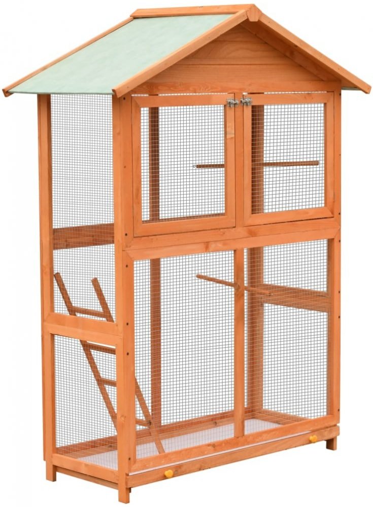 Tato dřevěná ptačí klec poskytne prostorný a útulný domov vašim ptákům, aby mohli létat a bezpečné si hrát. Vysoce kvalitní voliéra poskytne vašim ptákům spoustu místa k pohybu. Je pevně ohrazena železným drátěným pletivem, čímž napomáhá předejít neplechám a nečekaným nehodám. Drátěná mřížka je zkonstruovaná tak, že můžete ptáky bez obtíží pozorovat a ptáci mají široký rozhled po okolí a dostatek čerstvého vzduchu. Rám z masivního dřeva dodává voliéře pevnost a odolnost. Střecha je potažena zelenou nepromokavou látkou, která chrání před deštěm. Klec je rovněž vybavena žebříkem, po němž mohou ptáci snadno šplhat nahoru a dolů. Výsuvné dno ptačí klece vám usnadní její čištění. Sestavení ptačí klece je jednoduché.Barva: hnědá a zelenáCelkové rozměry: 125,5 x 59,5 x 164 cm (D x Š x V)Rozměry (bez stříšky): 104 x 46 x 160 cm (D x Š x V)Materiál: rám z masivního borového dřeva, práškově lakované železné pletivo, překližkaStřecha potažená voděodolnou tkaninou (100% polyester)Se 2 bidýlky a 1 žebříkemVýsuvný zásobníkOdolné vůči povětrnostním vlivůmVarování: Aby nedošlo k převrácení, musí být výrobek připevněn ke zdi pomocí přiloženého příslušenství.