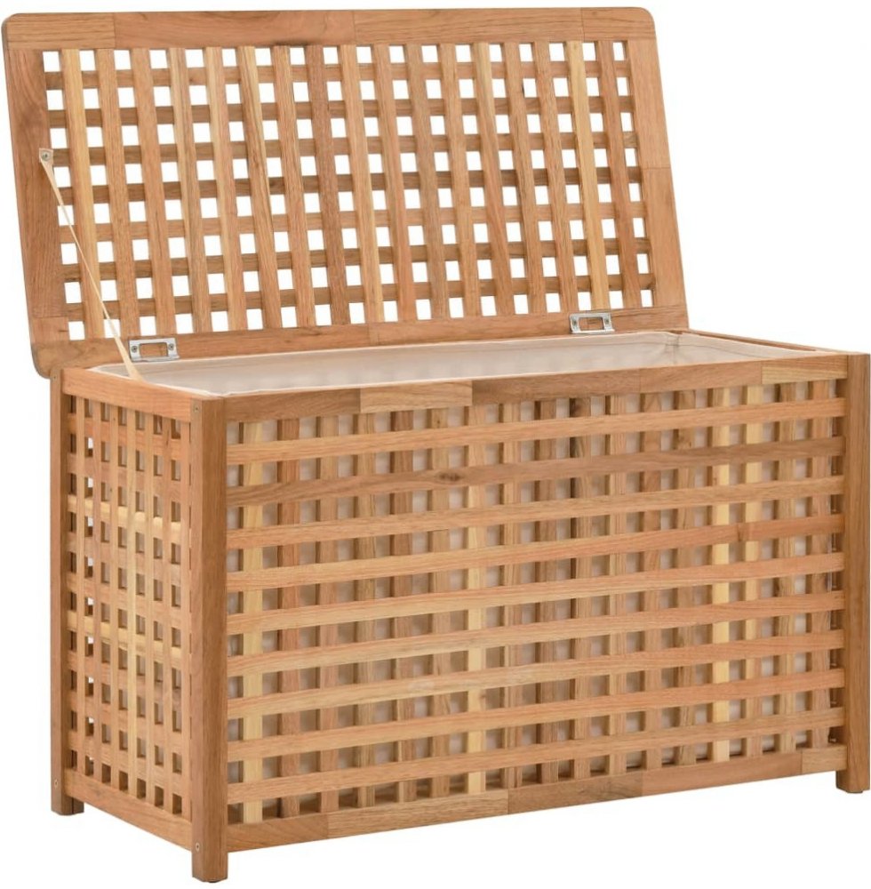 Náš koš na prádlo se stylovým přírodním vzhledem bude skvělým doplňkem do vaší koupelny nebo ložnice. Truhla na prádlo poskytuje dostatek místa pro ukládání věcí, jako jsou například ručníky, prádlo atd. Mřížkovaný design umožňuje dobré větrání věcí uvnitř. Truhla na prádlo je vyrobená z masivního ořechového dřeva a překližky, a je tudíž robustní a velmi odolná. Textilní vložku uvnitř úložné truhl...