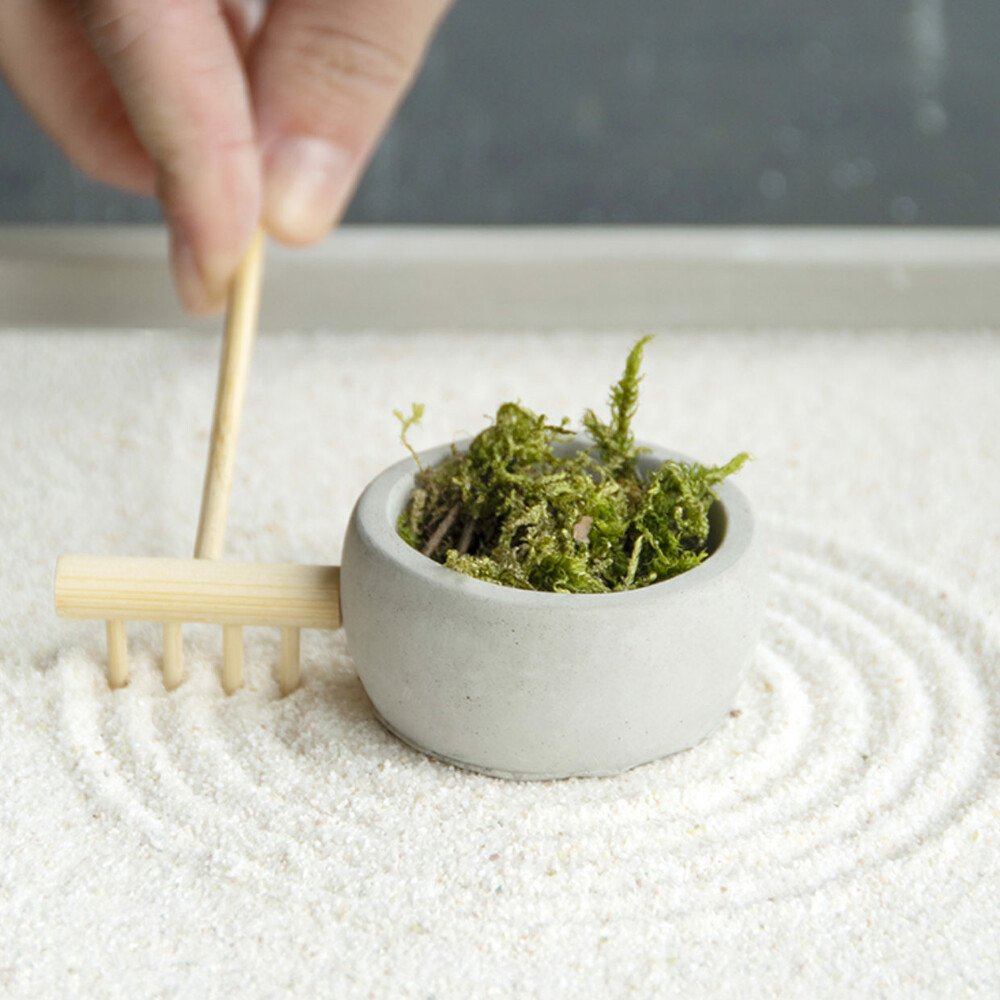 * sada se skládá z tácu, bílého písku, kamenů, květináče a dřevěných hrábí
