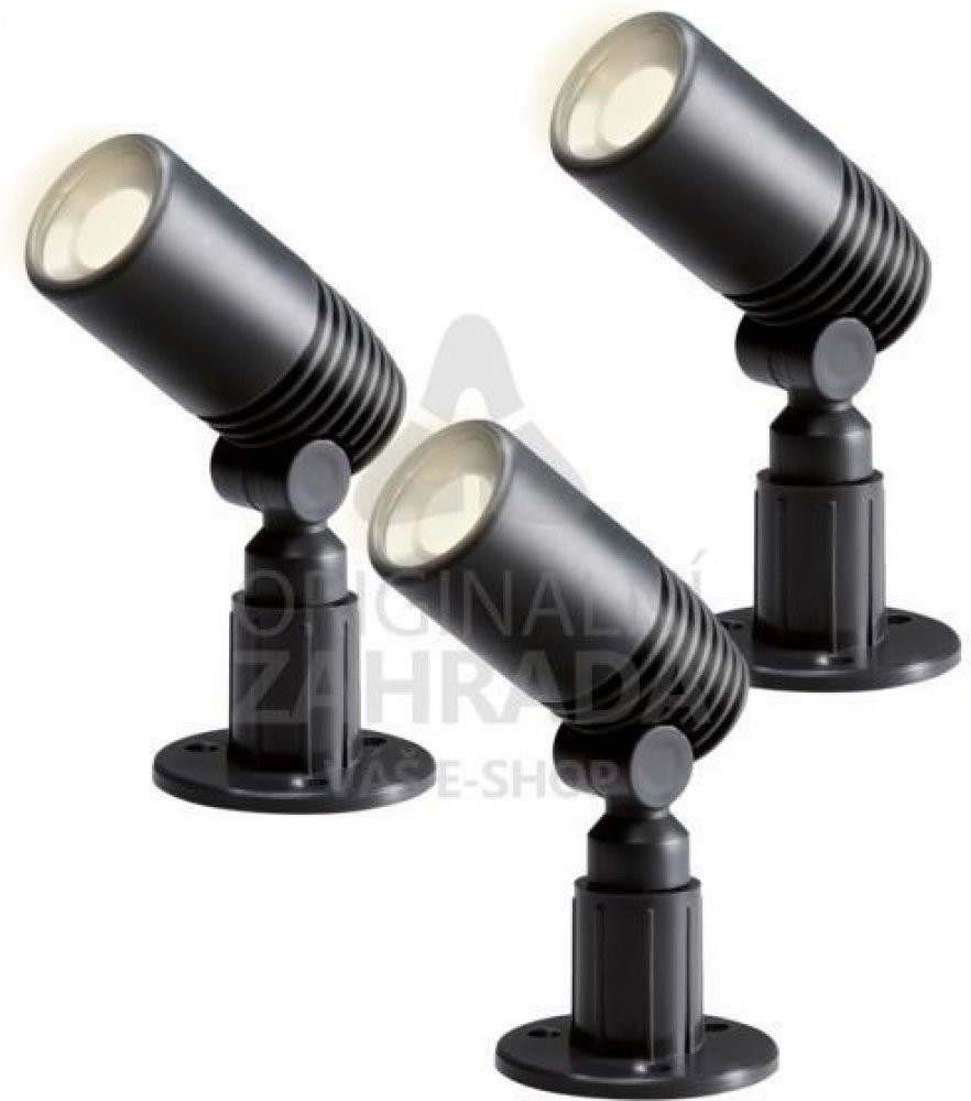 Sada tří dekorativních venkovních LED svítidel s napájením 12 V AC a nízkou spotřebou určených k osvětlení záhonů, skalek a cest v zahradách a dalších exteriérech. Sadu lze rozšiřovat pomocí samostatných zakoupených svítidel.