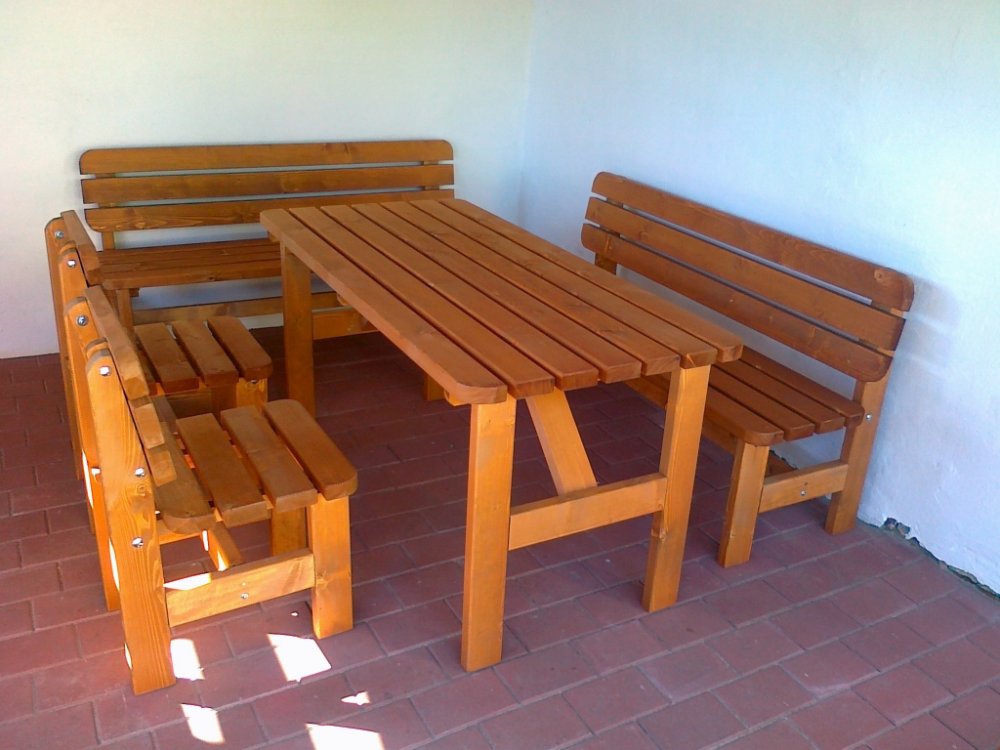 1 x stůl + 2 x lavice + 2x židleRozměry: stůl - š. 74 x dl. 150 x v. 74 cm lavice - š. 50 x dl. 150 x v. 80 cm výška sedu 44 cm, hloubka sedu 40 cm
