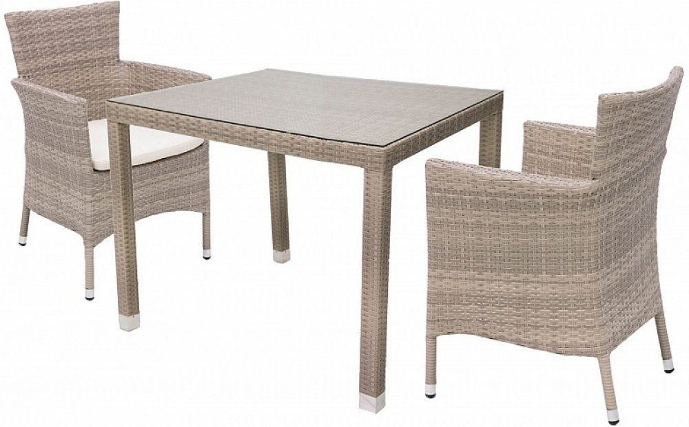 Sestava Modena je praktickým nábytkem na balkón a do menších prostor. Dopřejte si tento oblíbený zahradní set složený ze čtvercového jídelního stolu (80×80 cm) a dvou křesel s měkkými béžovými poduškami v ceně. Potahy polstrů jsou na zip, takže je můž...