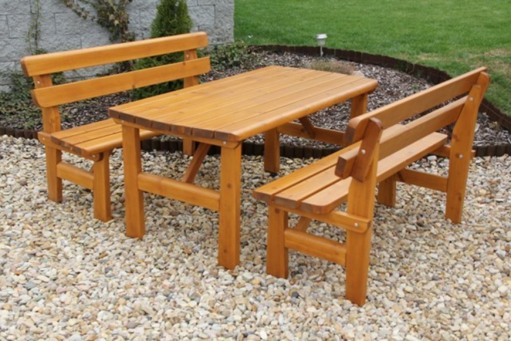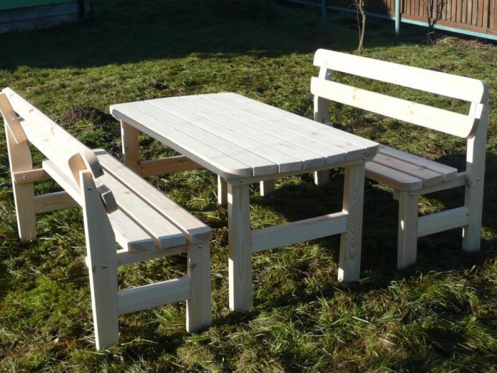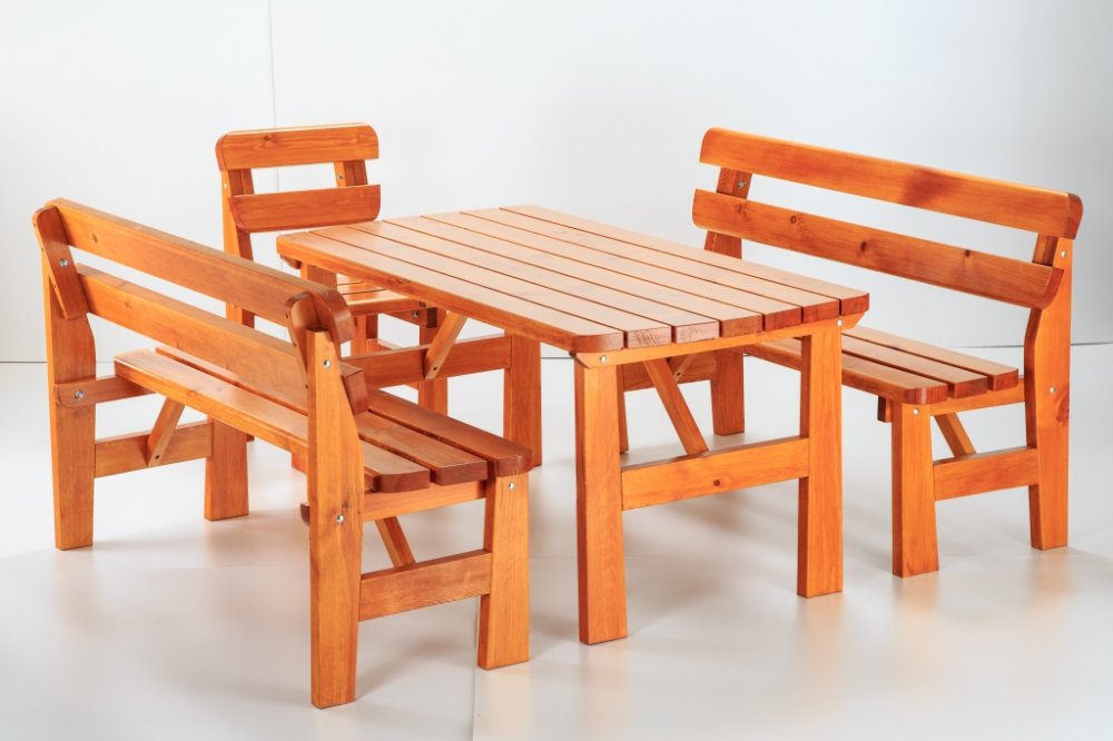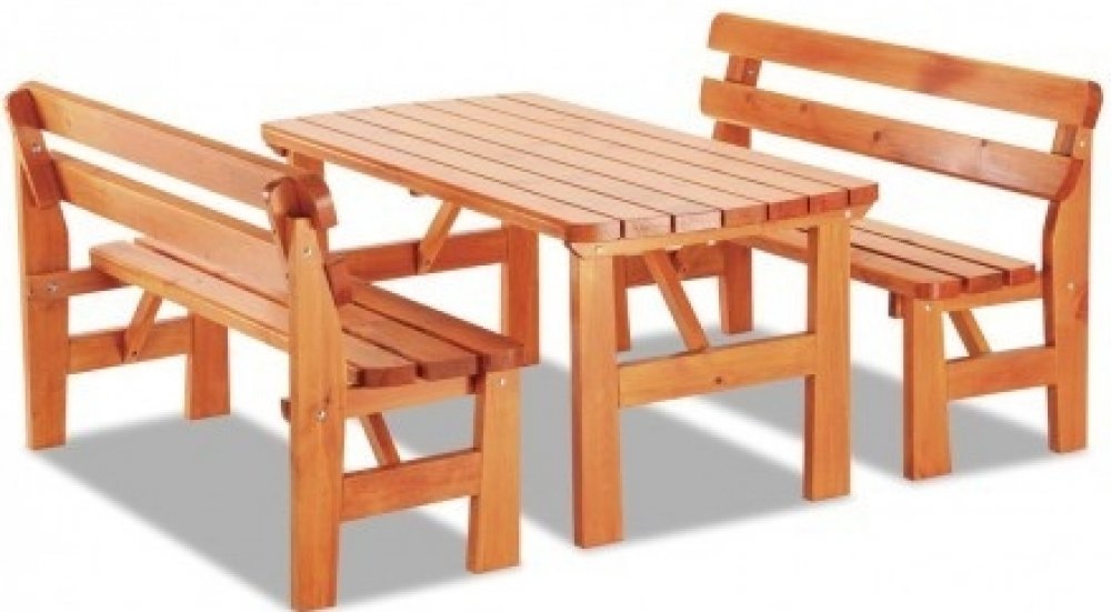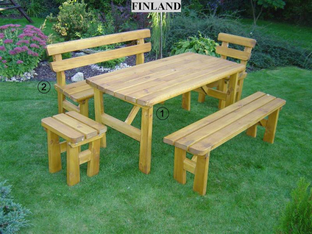 Kvalitní dřevěná zahradní sestava Finland vyrobená z borovice. Síla materialu 42 mm. Možné je i provedení bez povrchové úpravy. Sestava obsahuje 1x stůl, 2x lavice s opěradlem.