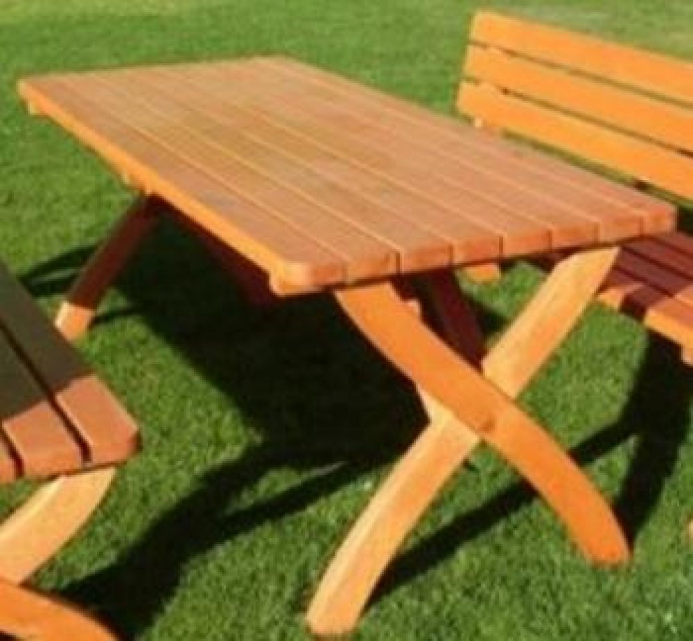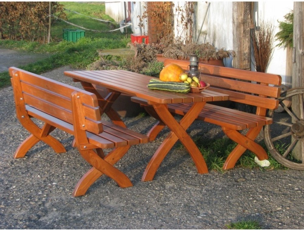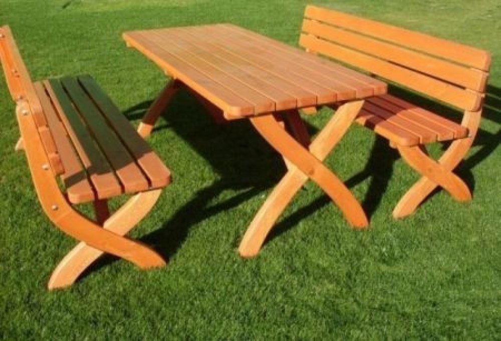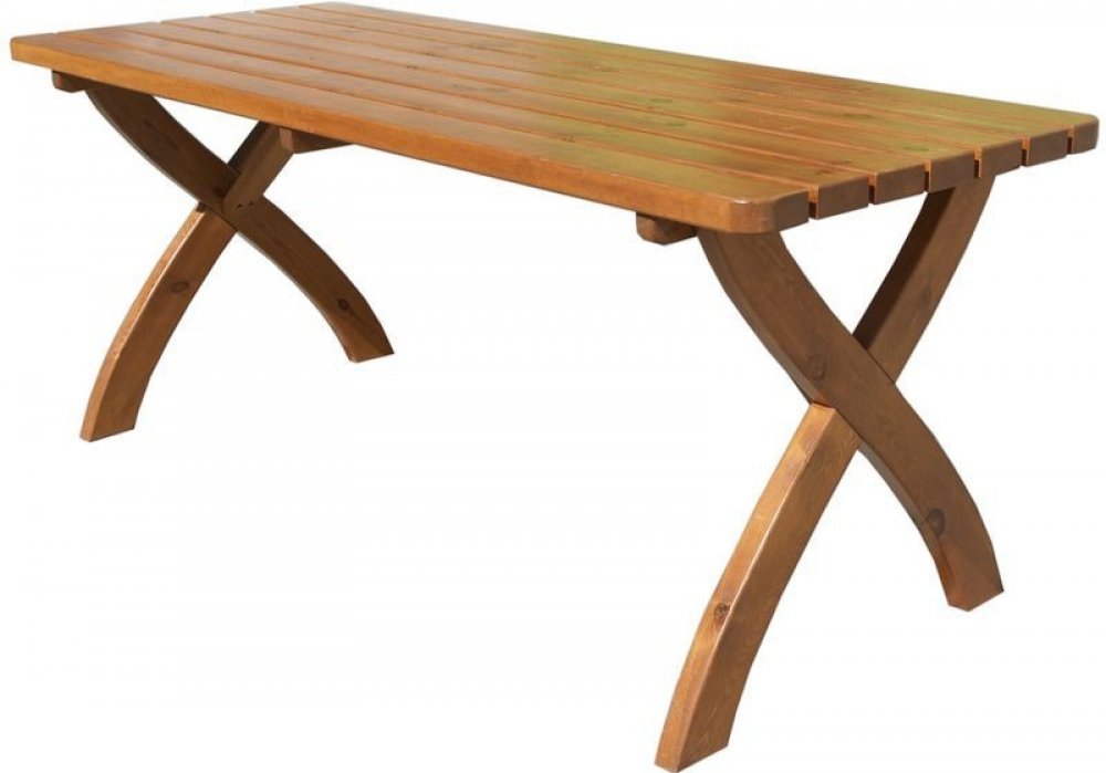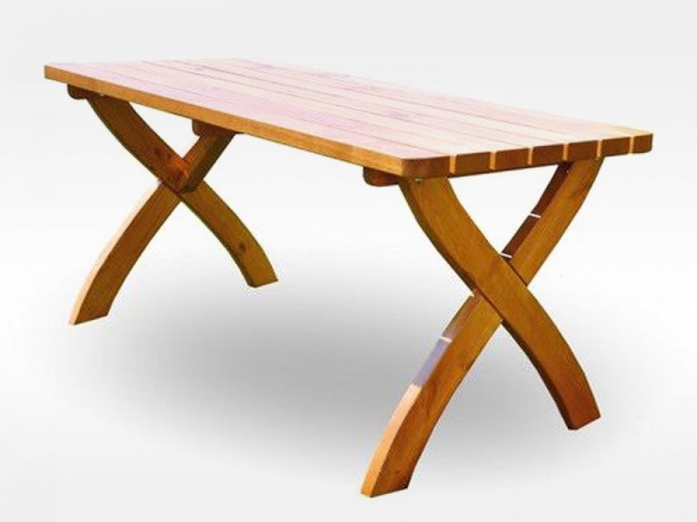 Masivní zahradní stůl z borovicového dřeva, které je lakované.