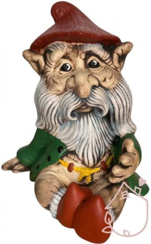 Sedící keramický skřítek se špičatýma ušima a milým výrazem ve tváři je vyrobený z povětrnostně odolné keramiky.