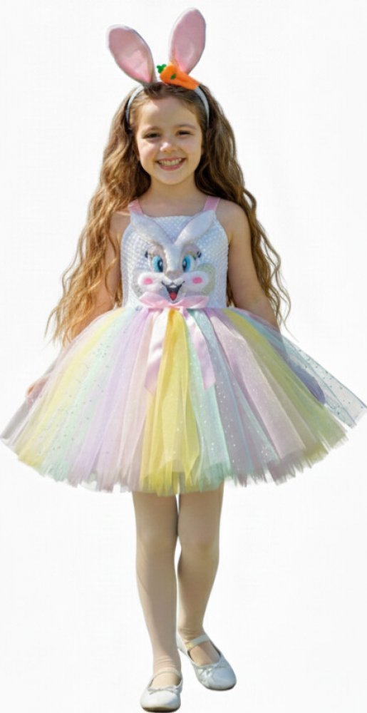 Část na trupu je z pružného materiálu, přizpůsobí se šířce těla, sukně je z více částí tylu, je nadýchaná, styl TUTU sukně. Ramínka tvoří širší stužka a její délku lze regulovat zavázáním vzadu.