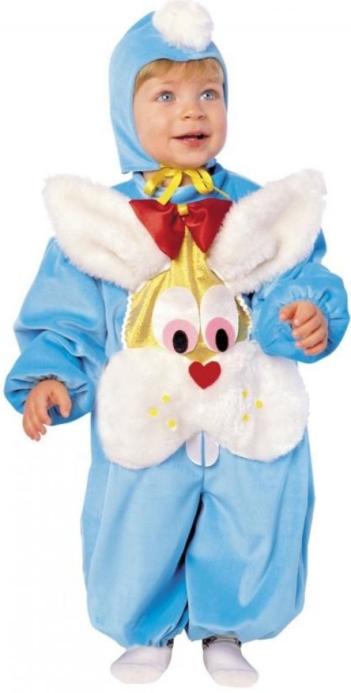 Modrý sametový overal má na břiše našitou velkou zaječí hlavu. Uši a tváře jsou z chlupaté bílé látky. Hlava je lesklá zlatá s velkýma bílorůžovočernýma očima. Na vršku zaječí hlavy je přišita červenožlutá mašlička. Jako čumáček je červené srdíčko. Hlava je doplněna dvěma zaječími zuby a žlutými tečkami na tvářích. Na kapuci, která se zavazuje na mašličku, je bílá chlupatá bambulka.